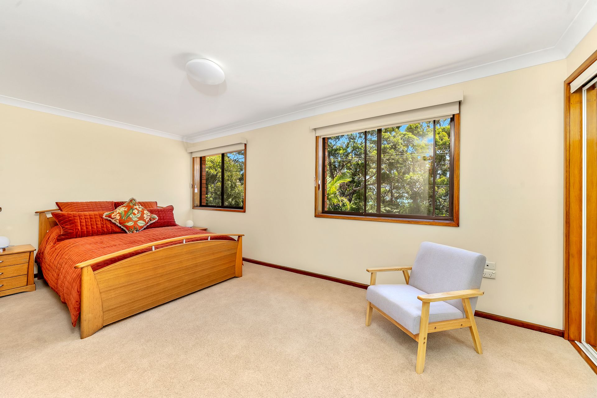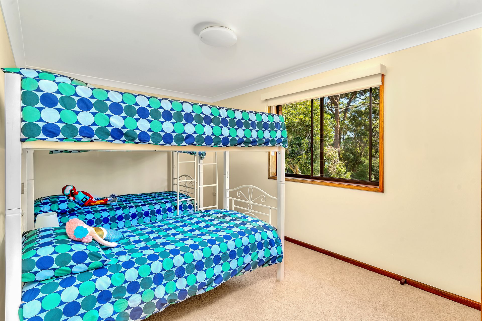 The bedrooms and bathrooms are located upstairs. The master bedroom has a queen bedroom and an ensuite with a bath and toilet. There are glimpses of Jervis Bay through the windows. The second bedroom has a queen bed and the third bedroom has 2 bunks. A shared bathroom features a combined shower and bath, and a toilet.