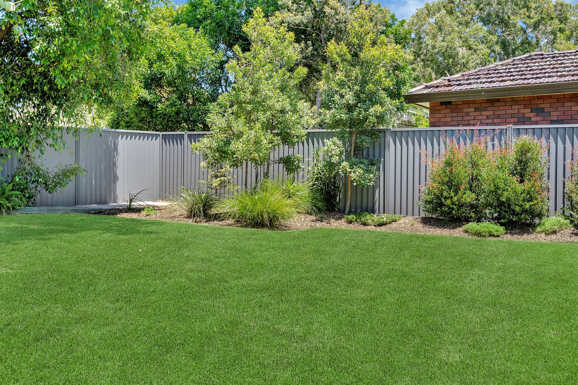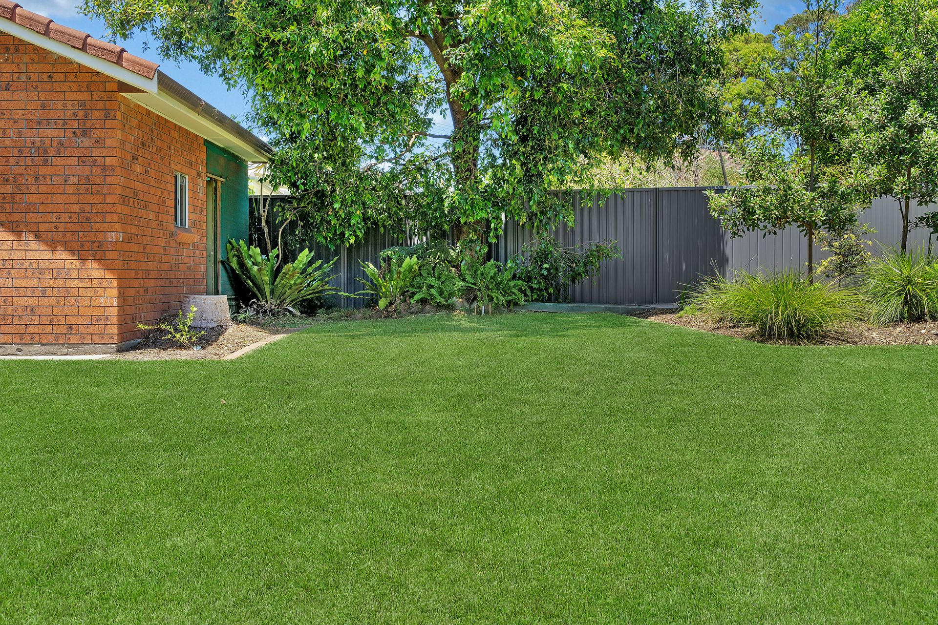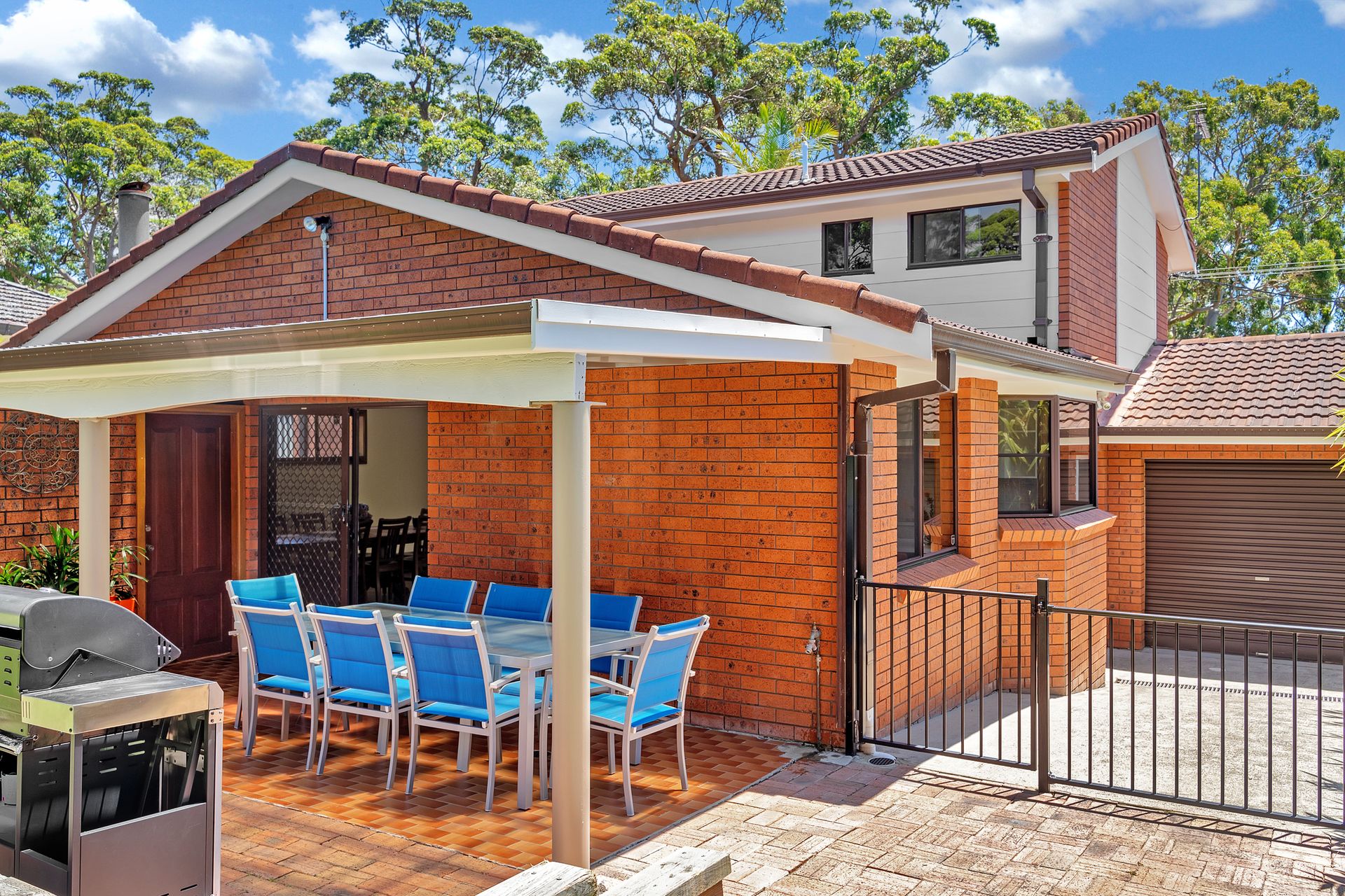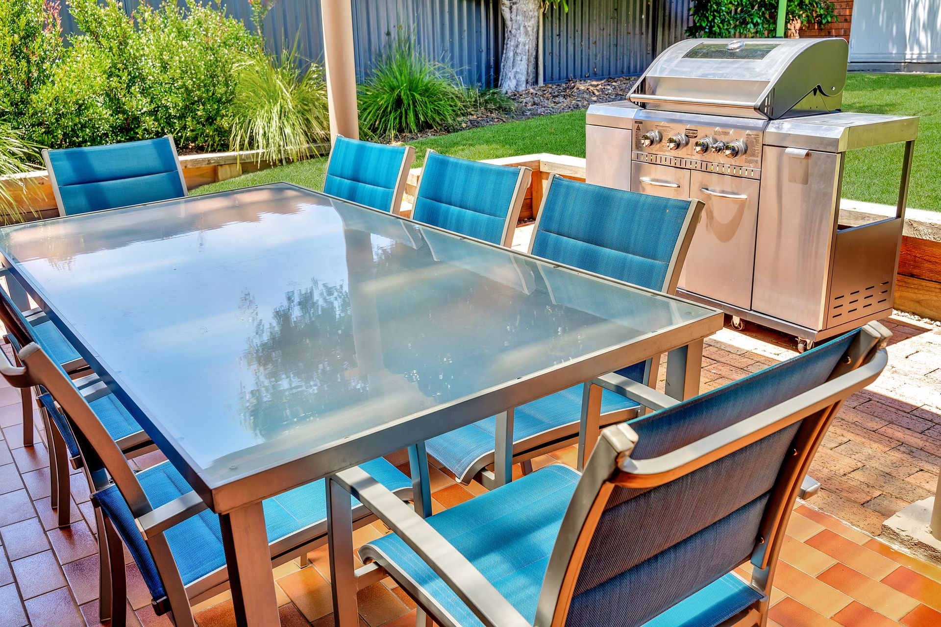 There is a fenced backyard, grassy area, BBQ and outdoor dining setting.