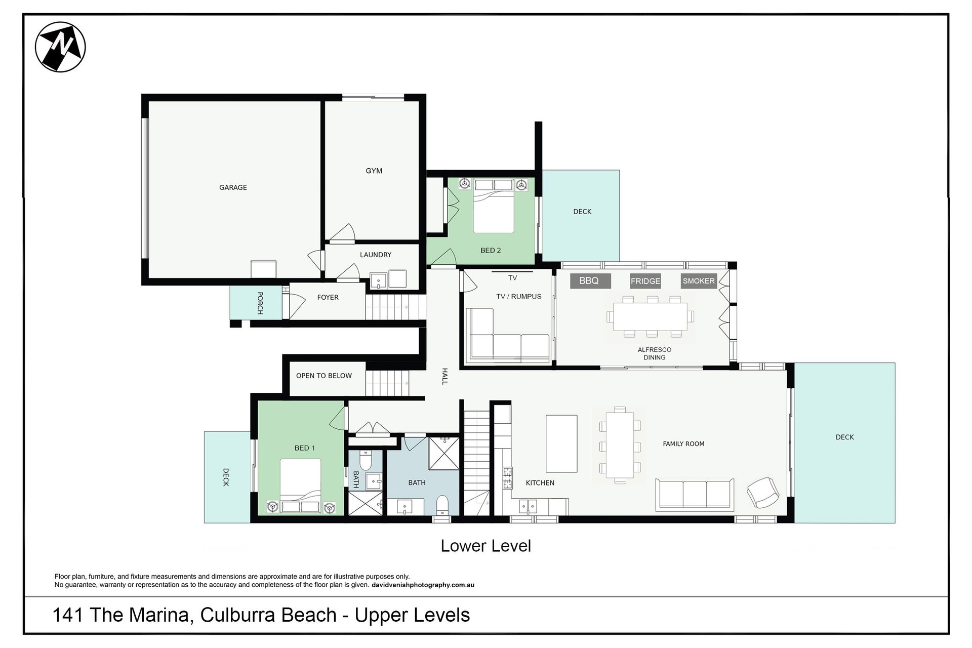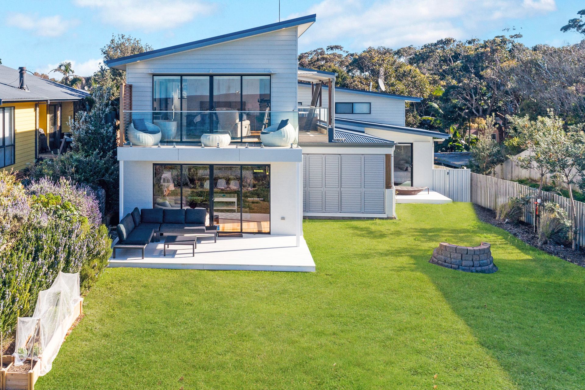 Beach perfect has a front and side deck of the master suite, a front deck off the living area, an alfresco dining and BBQ area, balconies off some bedrooms, and lawn / garden areas on both sides of the house, with landscaped gardens.