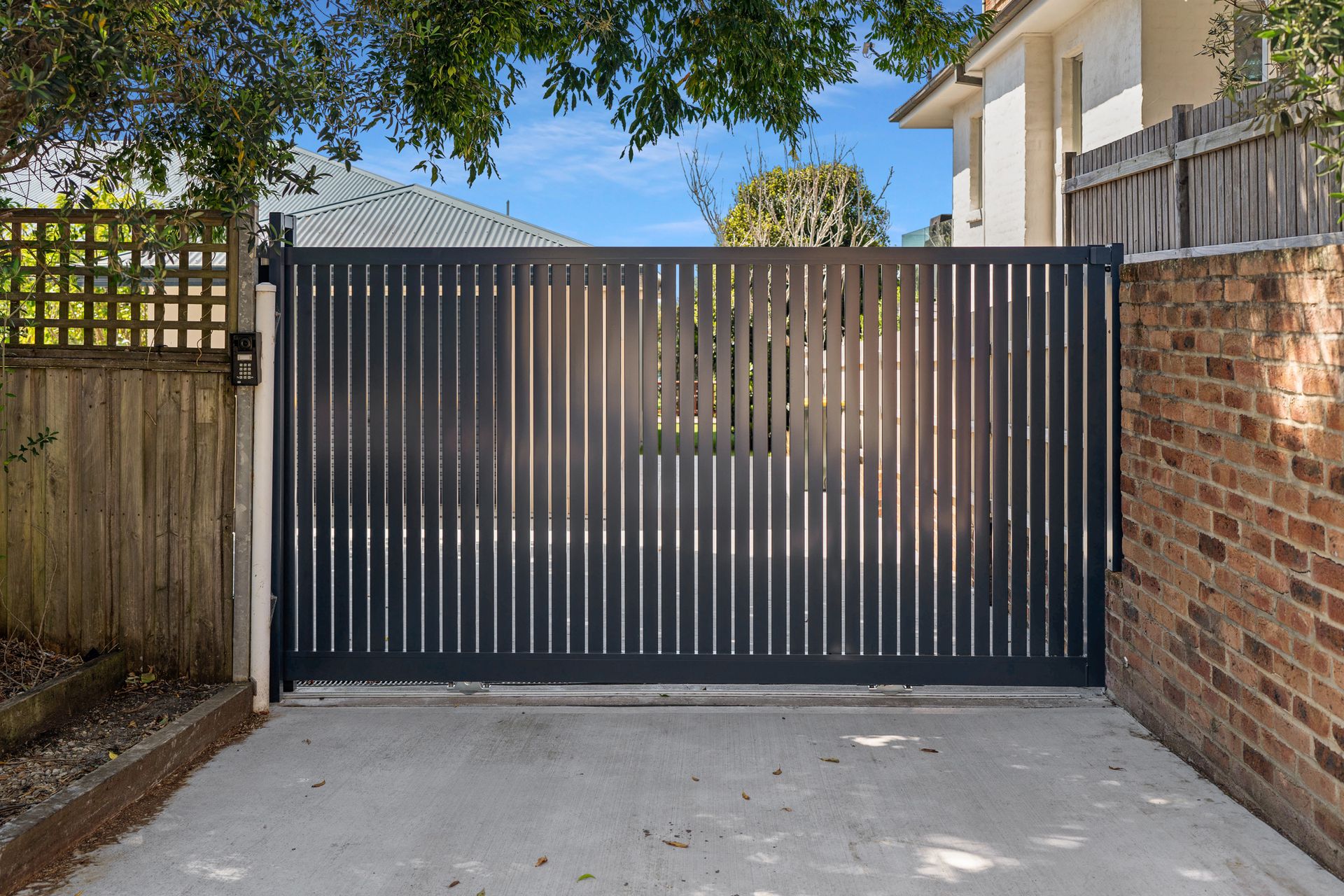 Parking is off the street behind a secure gate, with garage parking for one car and open air parking for four cars.