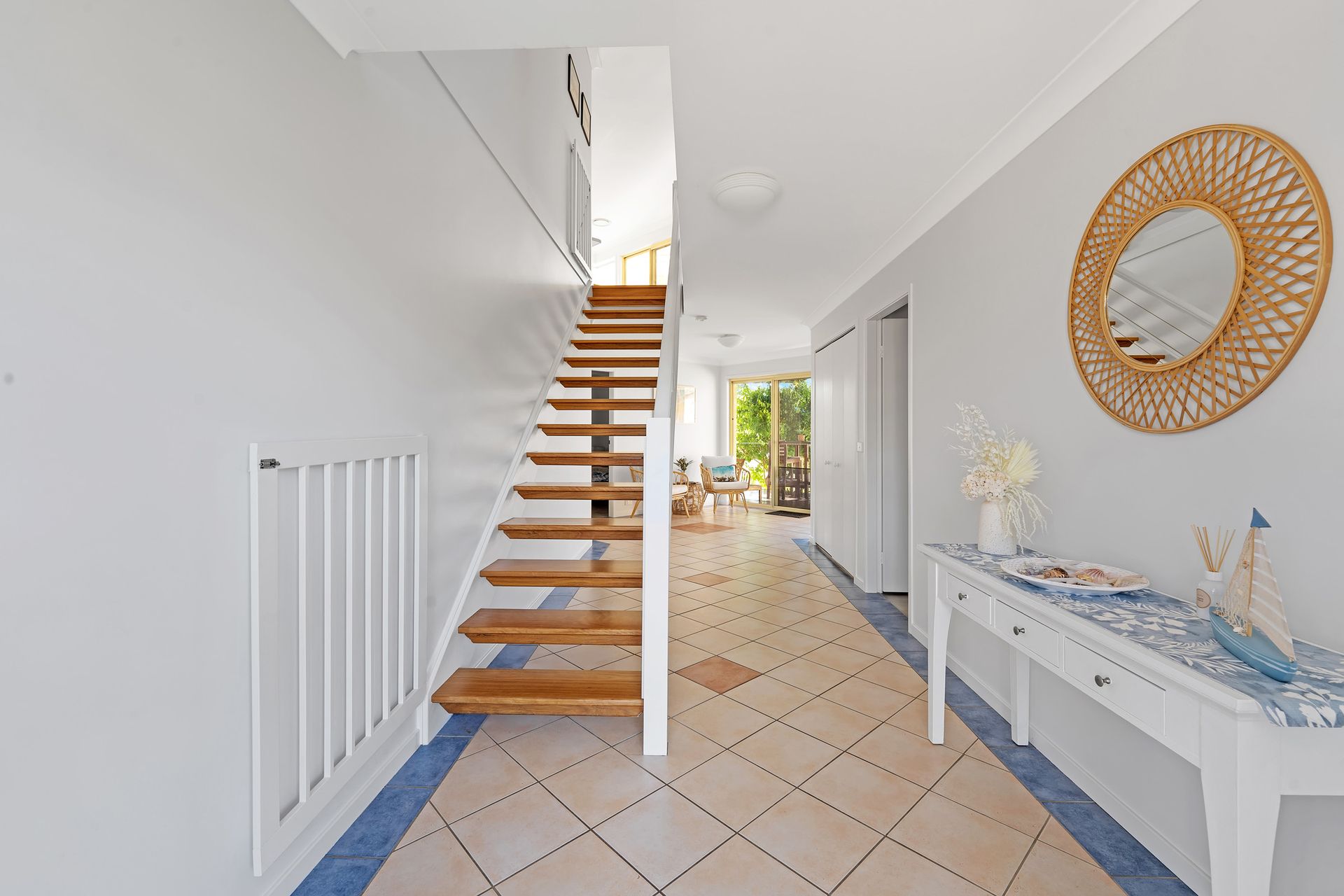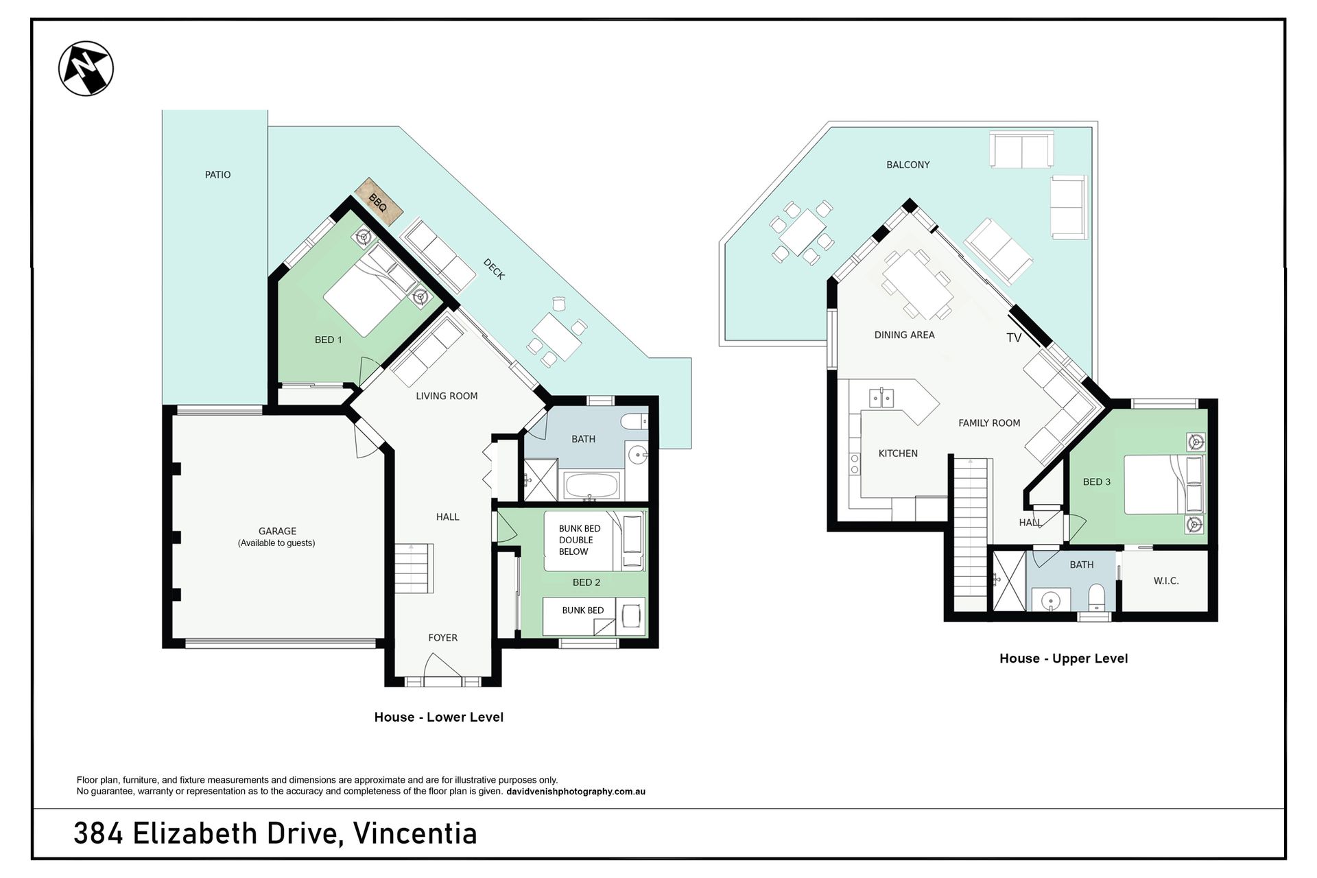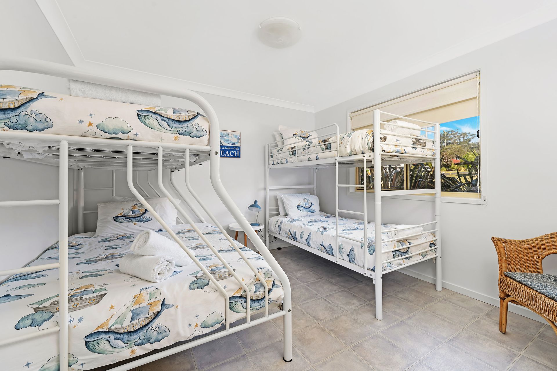 The main house at Blue Horizon Vincentia has two levels. Downstairs you will find two bedrooms, one with a queen bed and the other with a tri-bunk and bunk beds. There is also a European style laundry with a washing machine, bathroom, lounge area and access to the garage. Upstairs is the master bedroom with queen bed and ensuite, and the open plan kitchen living and dining room that opens onto the large deck.