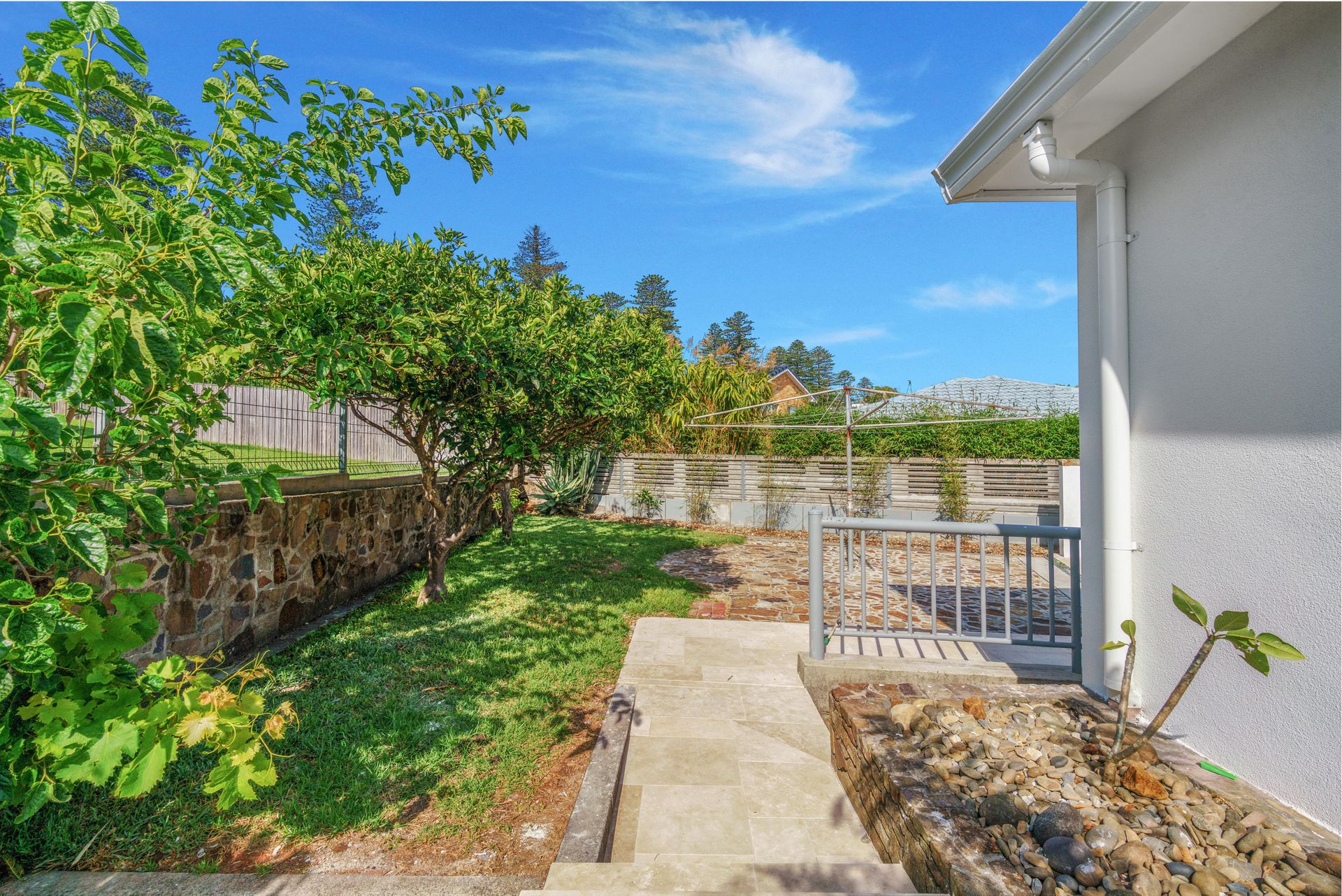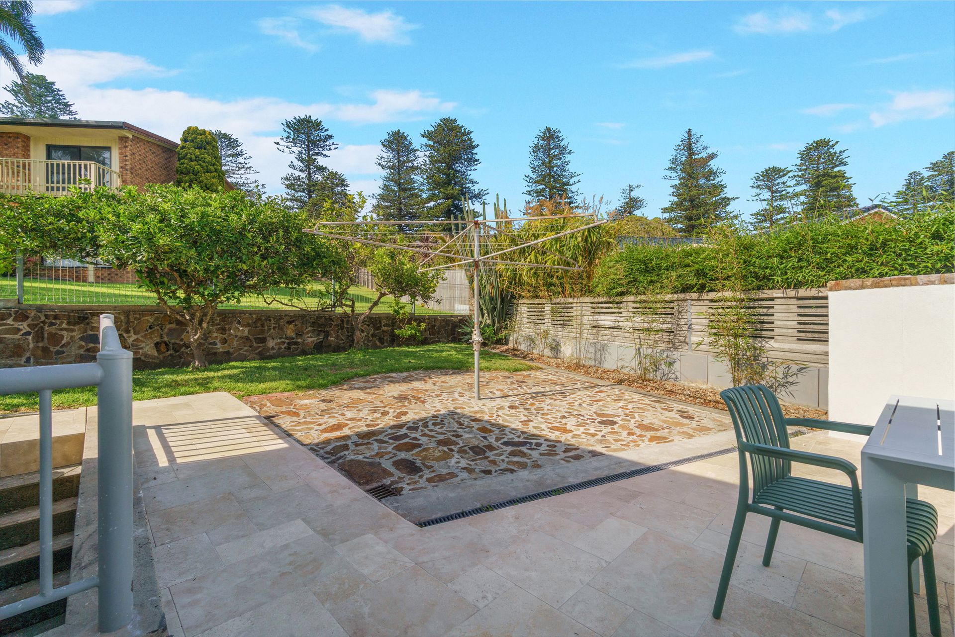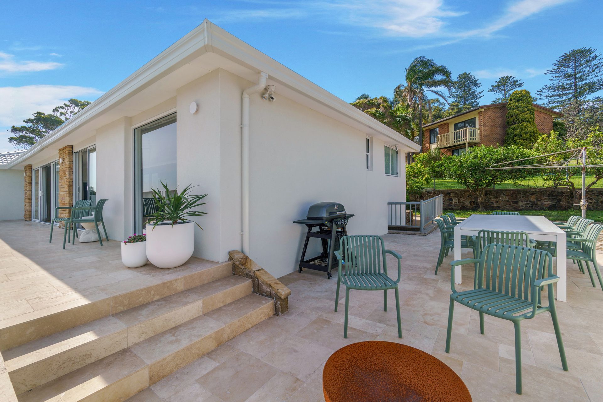The north facing verandah runs the length of the house, and guests will enjoy the mesmerising view from this space. There is a more protected entertaining area with BBQ and dining table seating 10 guests, and a classic Hills Hoist to hang your beach towels on after a day at the beach!