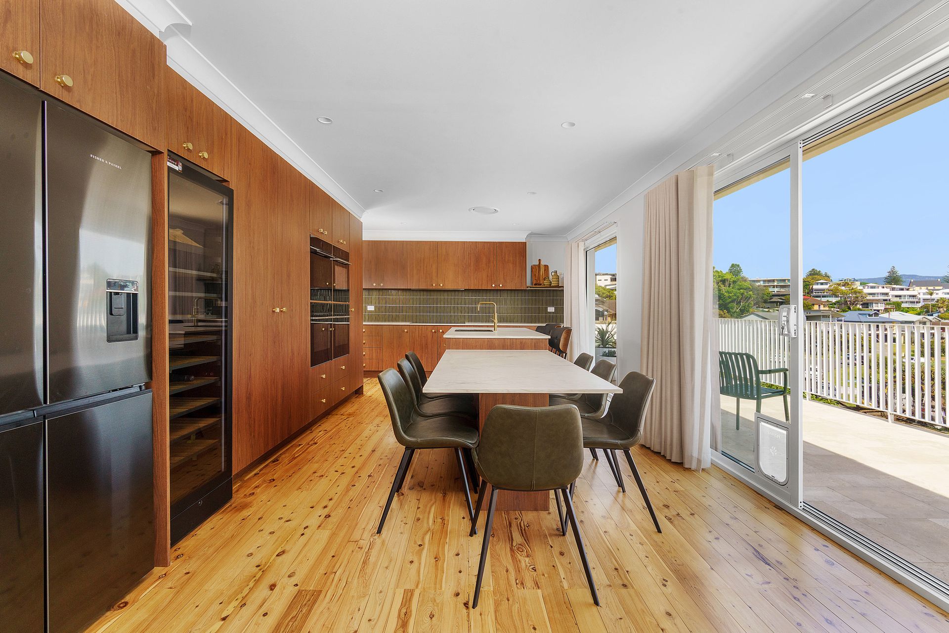 Burri Burri is accessed via a set of stairs up to the deck. Once upstairs, the inside of the house is all on one level. There are 4 bedrooms; the master with a king bed and ensuite with bath, shower and toilet, a queen bedroom with an ensuite with a shower and toilet and a queen bedroom and room with 2 bunks that share a bathroom and separate powder room. The large, open plan living area has amazing views. The gourmet kitchen has a dine in island bench, and opens onto the large deck with BBQ and 8 seater dining table.