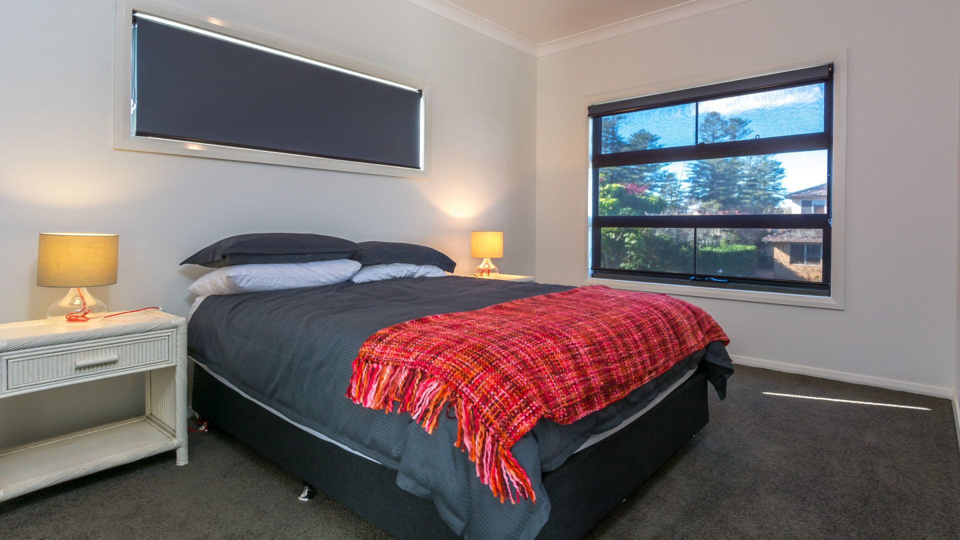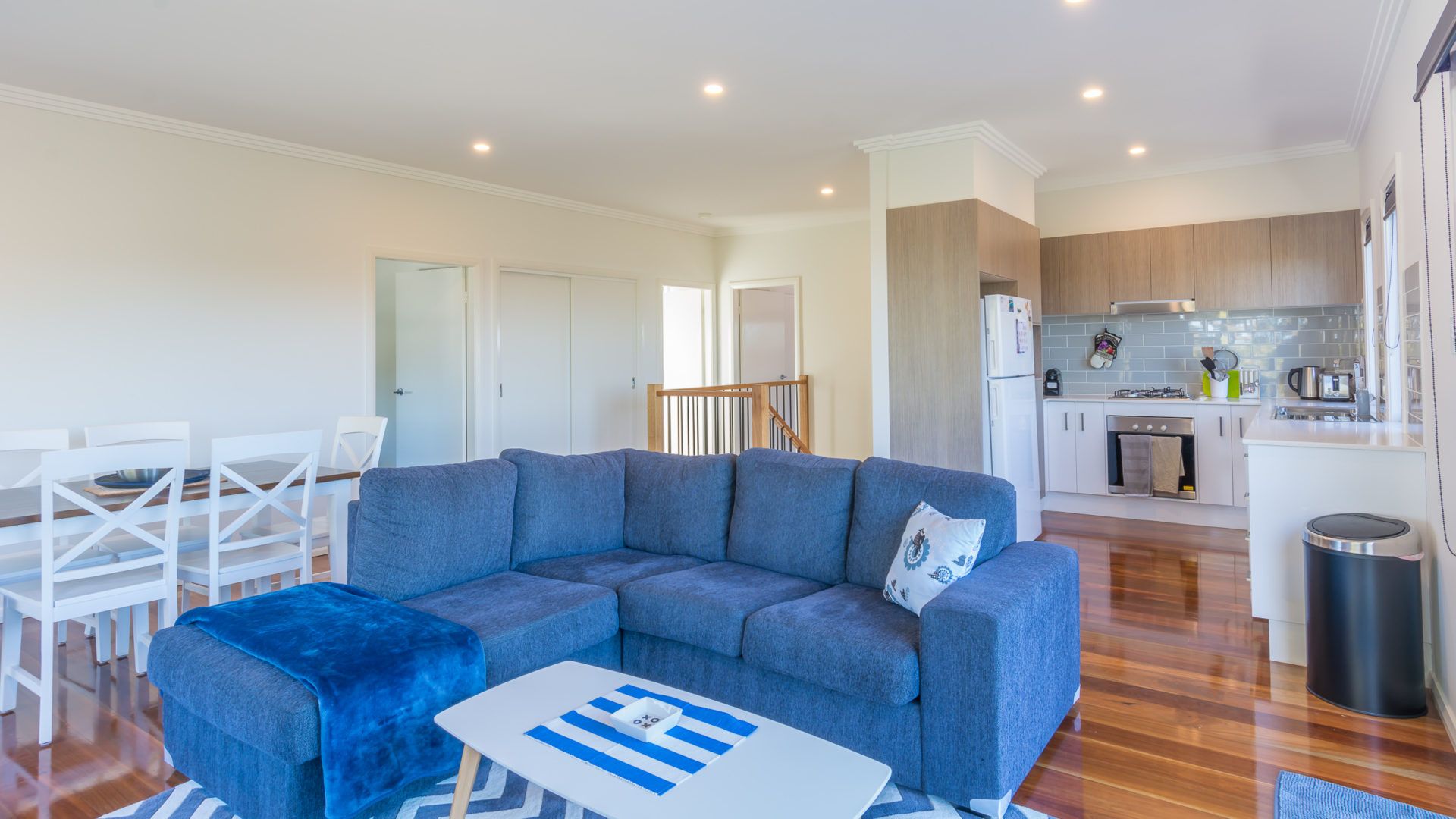 Coastline is a double storey house. There are three queen bedrooms, all with blockout blinds. The main bedroom is downstairs and has a walk in wardrobe and ensuite with hobless shower, vanity and toilet. Also downstairs is a tiled living area with TV, three seater lounge, a laundry with washer and dryer and separate toilet and a double garage with internal access.