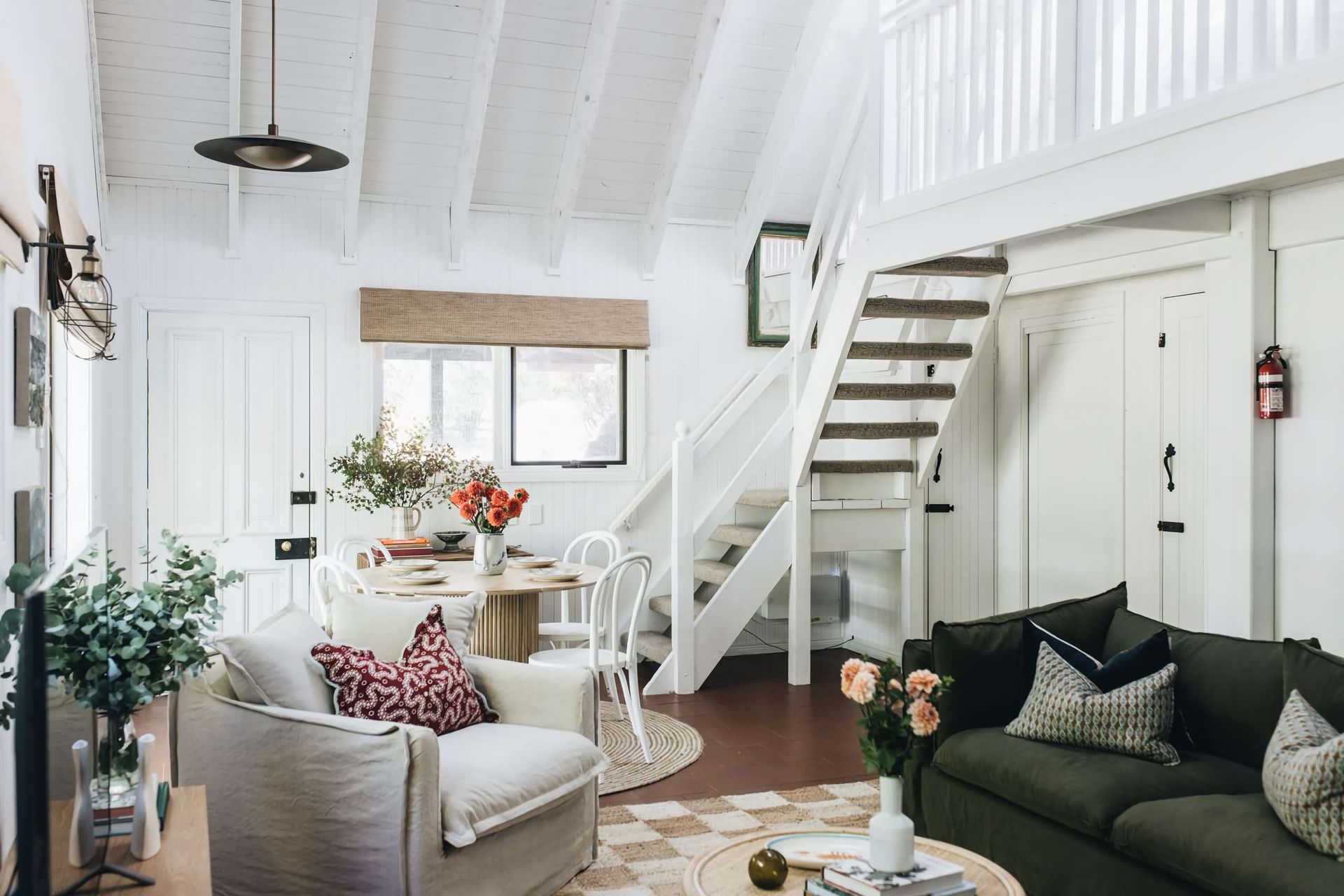 Coromandel Cottage has a mezzanine design. The living areas and master bedroom are downstairs. The queen bedroom is located on the mezzanine above the living area. It is a romantic spot with a queen bed under the vaulted ceiling, a vintage privacy screen to change, and windows above the bed that allow the sunshine to gently wake you should you wish. It is accessed via the staircase and has a second bathroom with shower at the bottom of the stairs. Please note that the stairs are somewhat steep, so this space is not suited everyone, particularly the elderly or children.