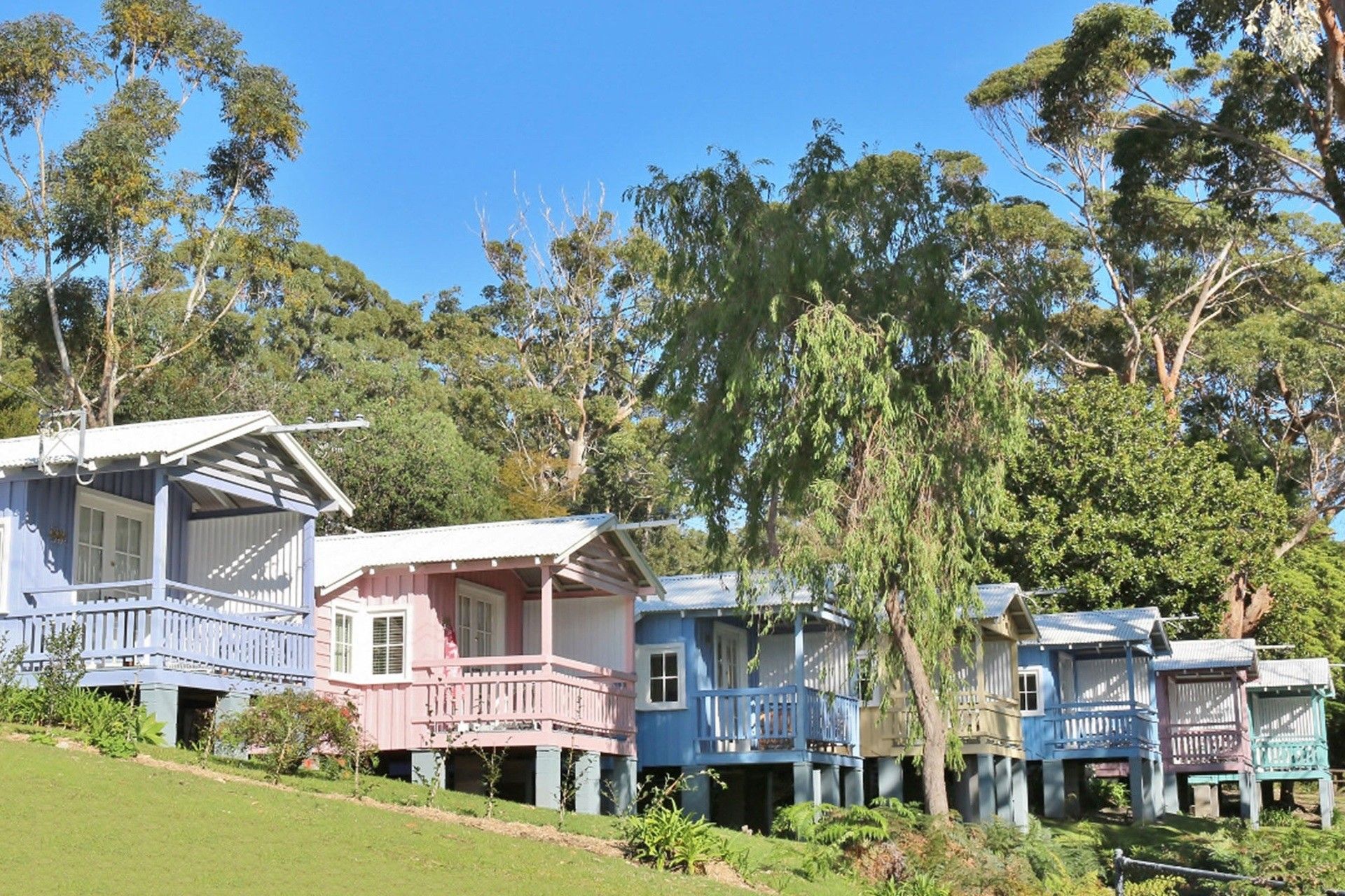 The Hyams Beach Seaside Cottages are quaint colourful heritage cottages nestled along a creek with north facing verandahs. They are the perfect spot to take in the tranquility of Jervis Bay. The cottages contain a bedroom with ensuite, sitting room and a balcony overlooking the small tree-lined creek that crisscrosses the site. The staggered layout of the cottages ensures that each has a view towards Jervis Bay from a north facing deck. The beaches and café are only minutes from your front door! Perfect couples only getaway.