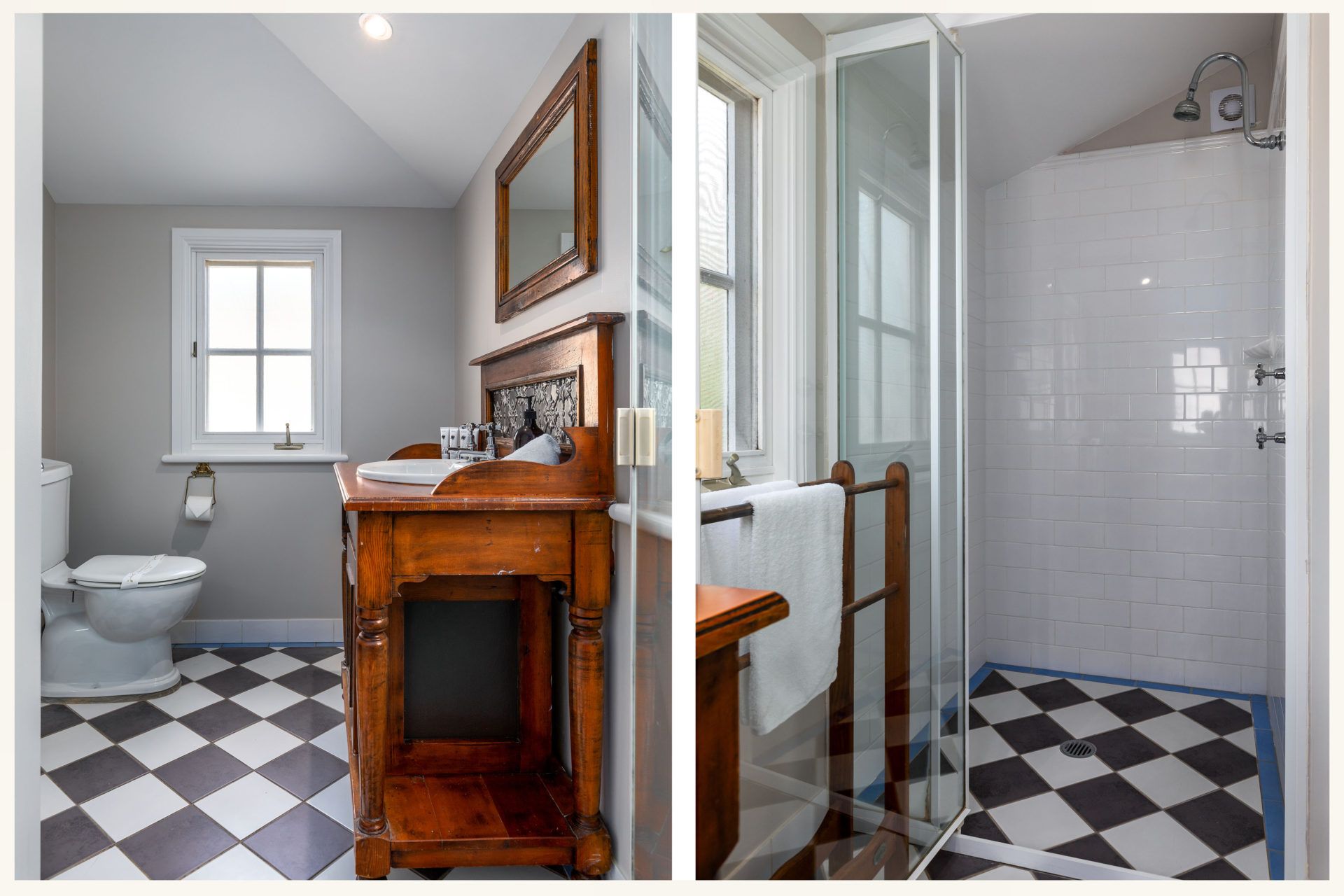 - Cottage Five has a shower, vanity, and toilet configuration in its bathroom.