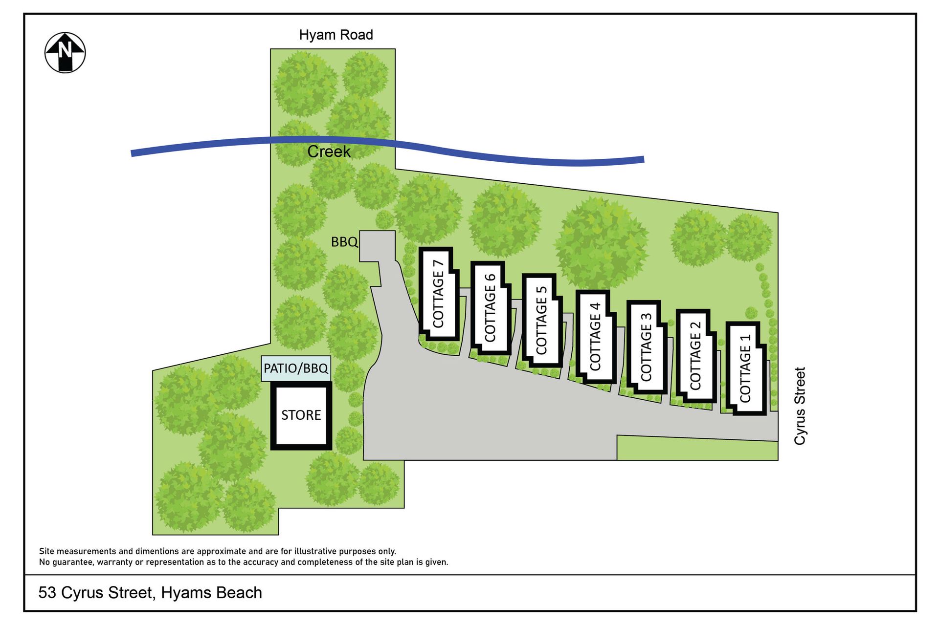The Hyams Beach Seaside Cottages are located at 53-55 Cyrus Street and are set amongst lovely gardens and trees. They are in the heart of Hyams Beach yet set back for privacy and seclusion. Cottage Oneis located nearest to the road, and Cottage Sevenis located at the rear of the block. All are within easy walking distance of the beaches and cafe, and the whole complex has a lovely riverine setting, with views to the bay from every cottage.