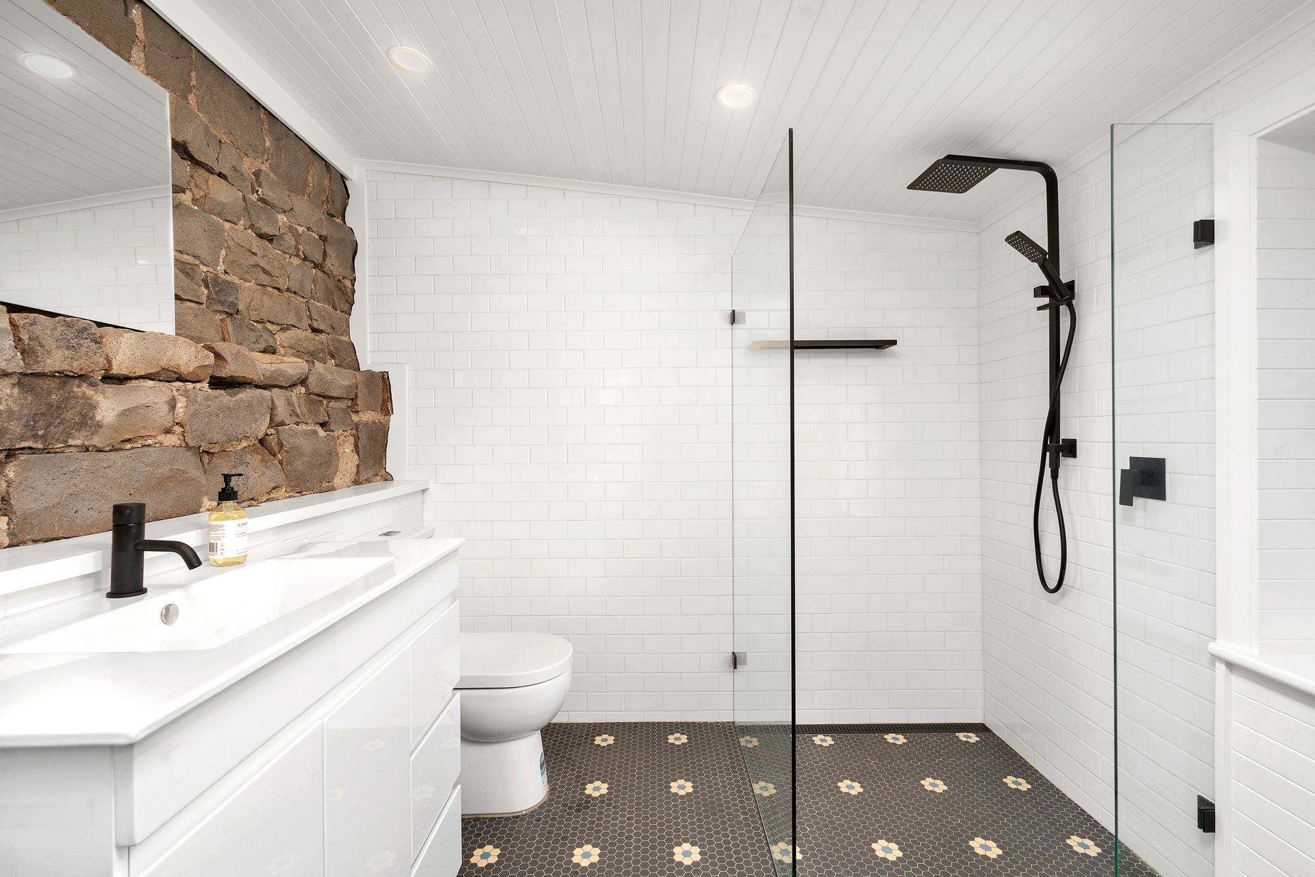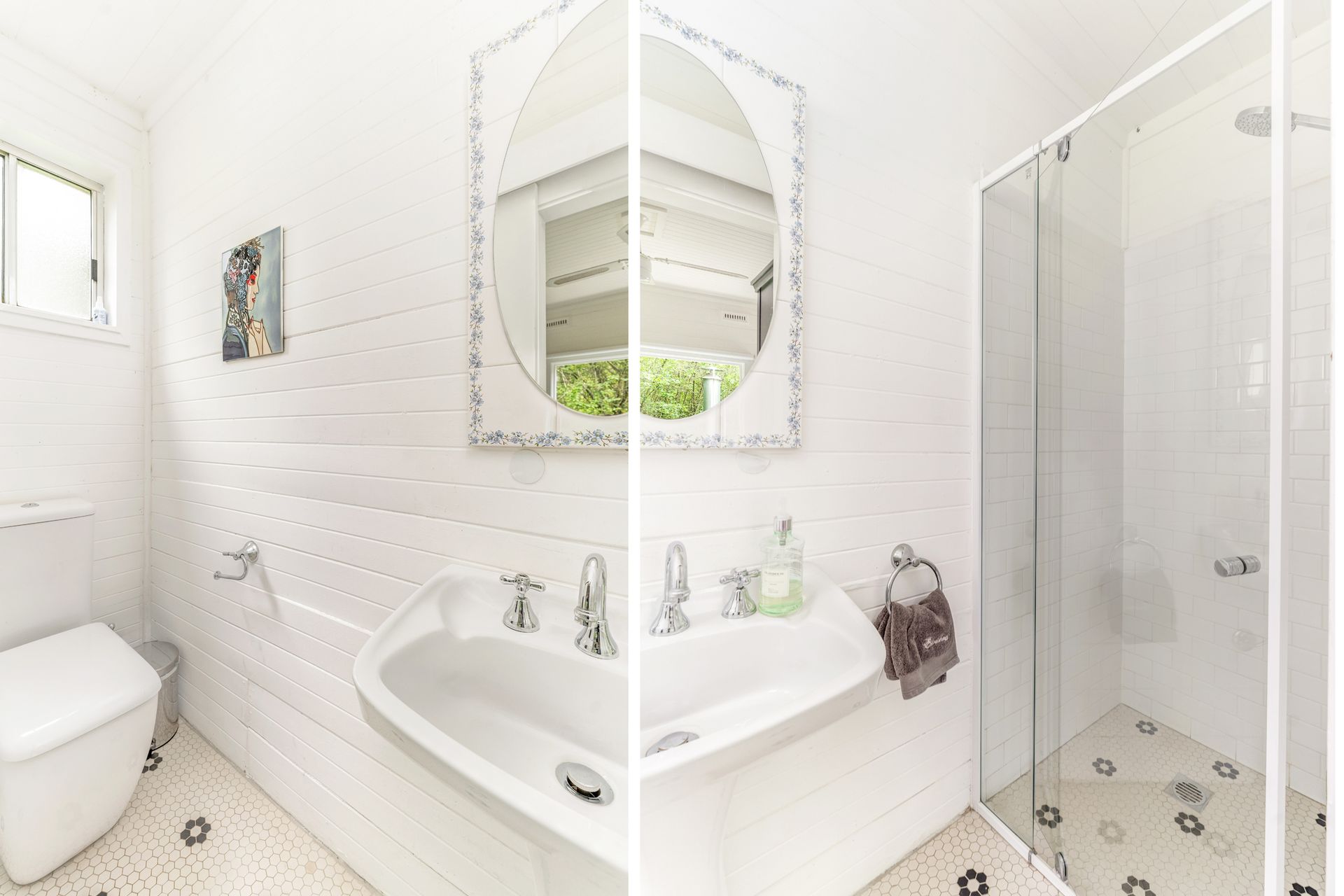 The main house has three bedrooms downstairs, two bedrooms upstairs, and an additional bedroom downstairs. The master bedroom downstairs has its own large en-suite, two bedrooms downstairs share a bathroom, and each of the upstairs bedrooms has it own shower / toilet bathroom - a total of four bathrooms for five bedrooms.