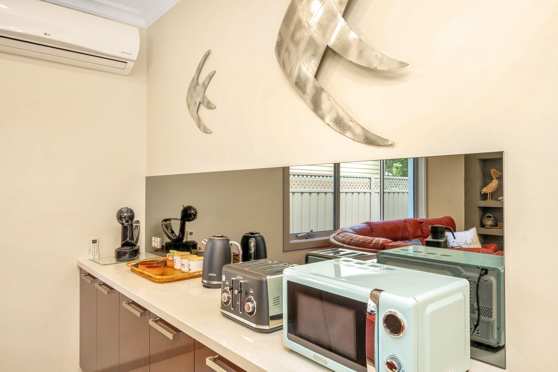 Gather at Vincentia has a wall mounted reverse cycle air unit (for heating and cooling) in the downstairs living area. All bedrooms have ceiling fans. The house can also be opened up fully in summer to catch the sea breeze. Each bedroom has a portable, thermostatically controlled electric heater for the cooler months.