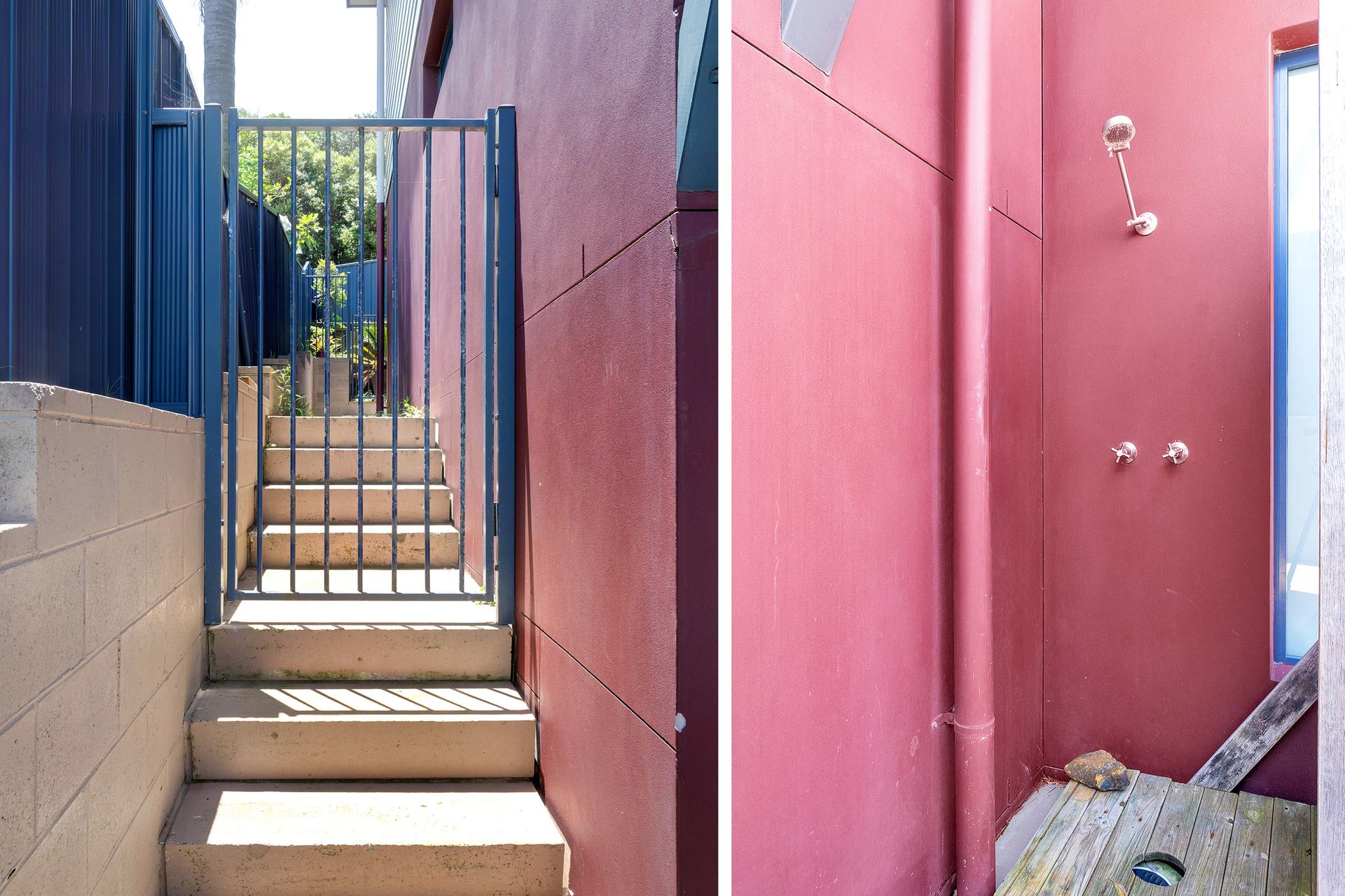 Entry level - car space, entry hallway with internal stairs, 1.5 car lock up garage for guest use, outdoor shower, gate leading to fenced yard at the back of the house, and a front garden to street that gives good privacy from the road.