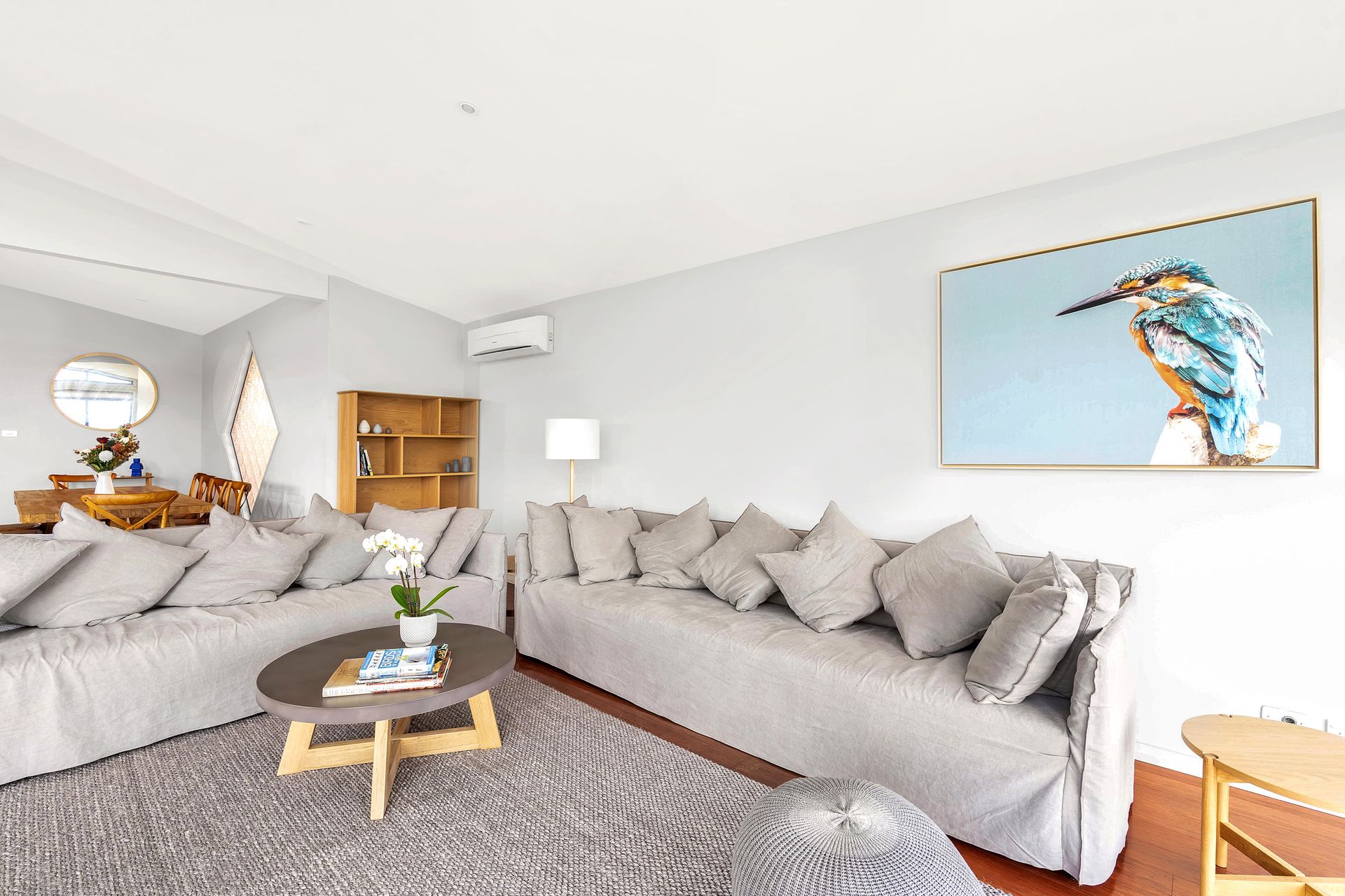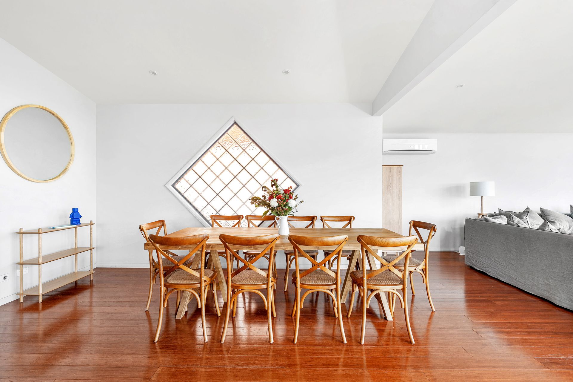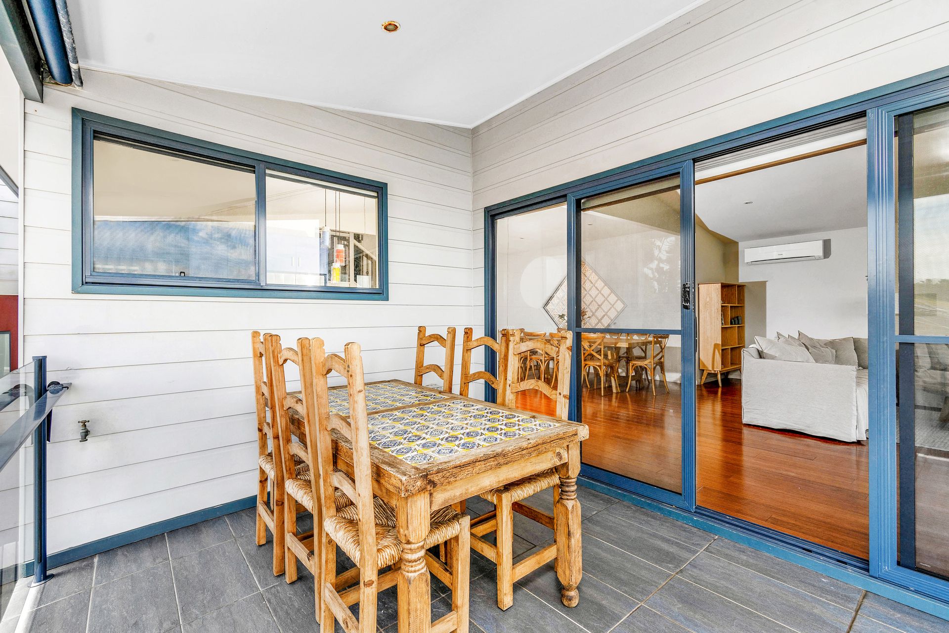 Main living area - large open plan kitchen, dining and living area, with a large covered ocean facing deck attached. The living area has a split system air conditioner. Th kitchen is equipped with a mini barista coffee machine that takes whole coffee beans.