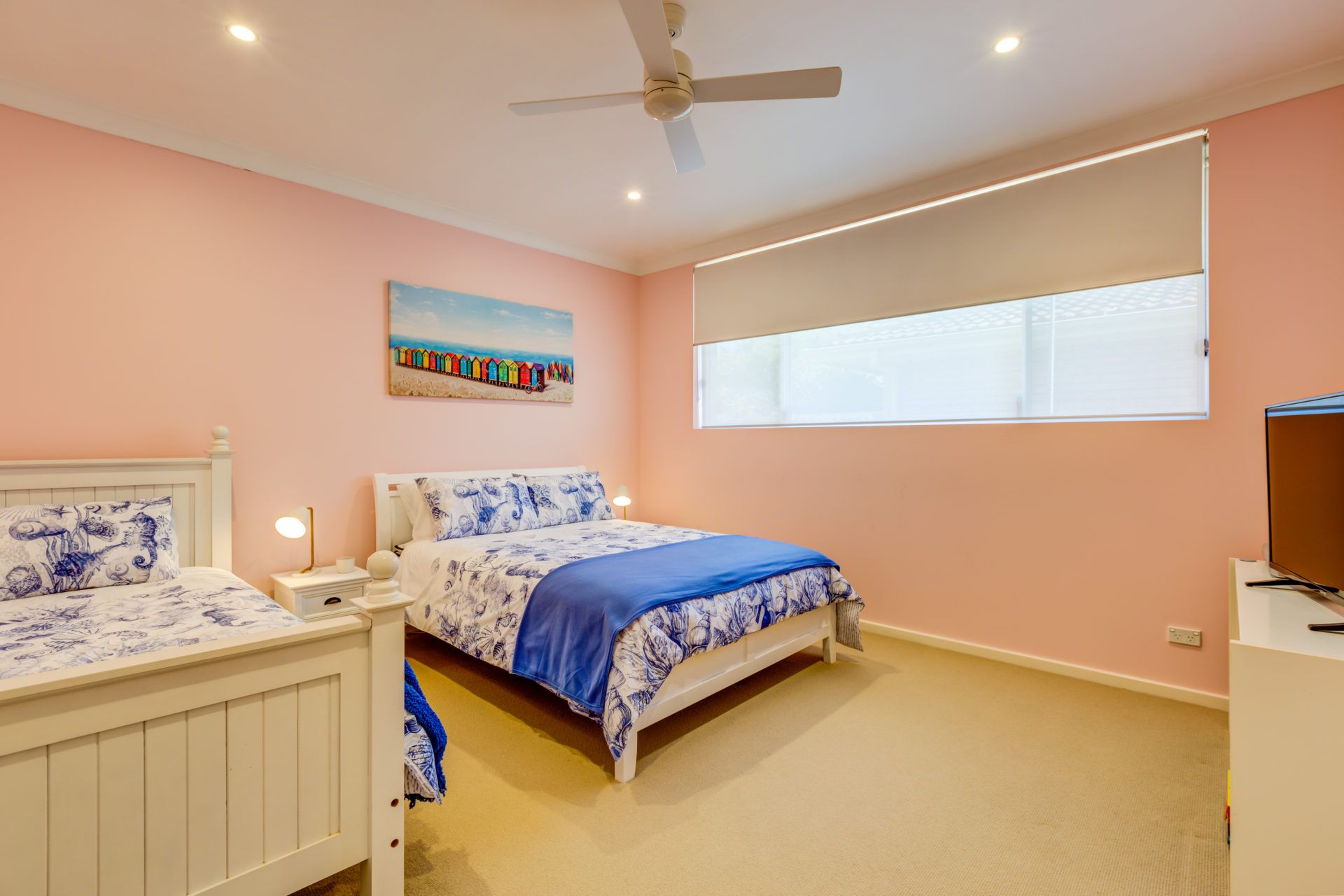 When you enter Harlequin Beach House you will find the bunk room immediately to your right and the laundry to your left. Further down the hall you will find the shared bathroom, plus a third toilet, the two bedrooms both with a queen and king single bed as well as the entrance to the courtyard and BBQ area. At the end of the hall is the master bedroom, with ensuite and king bed, as well as access to the verandah with views over the bay to wake up to. The open plan kitchen/dining/lounge area have views of the bay and access to the wide verandah, a perfect place to sit back and relax!