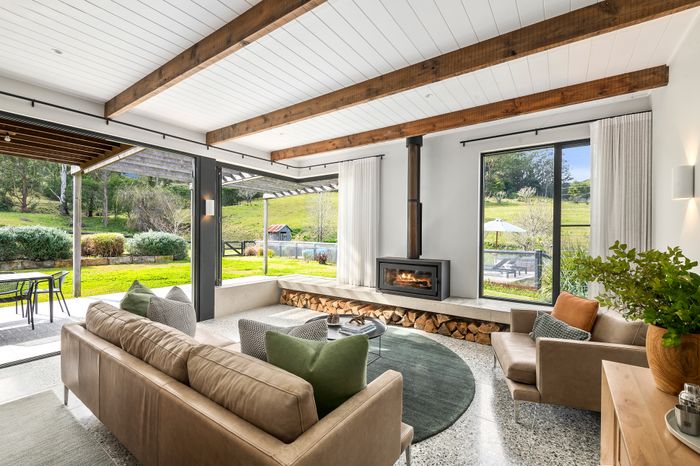 The outside area is just stunning, with views to the green paddocks behind and the escarpment to the front. The inground swimming pool and the cedar, log fire heated hot tub are perfect for relaxing. An outside fire pit and under cover dining area, complete with a BBQ, are the ideal spots for your group to relax together.