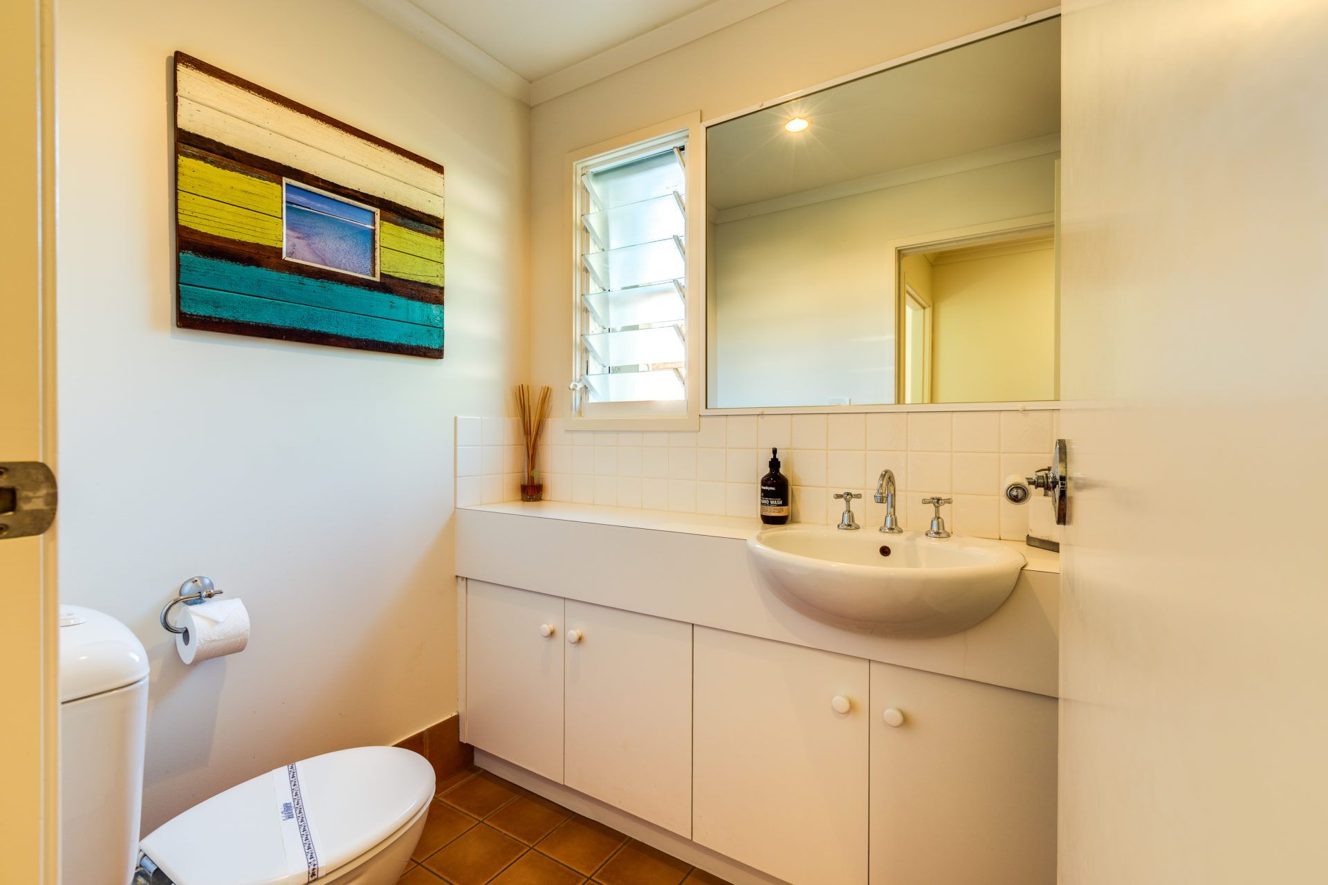 On the ground floor there are two beautifully decorated bedrooms with windows looking into a leafy courtyard garden. One bedroom has a small private deck accessed via sliding doors. Also on this level is a bathroom with a shower plus separate basin & toilet. The laundry is hidden behind cupboard doors close to the bathroom. The upstairs level opens into a light, airy open plan living space with two seperate decks faced towards the ocean. The house also has a cot, safety gate and high chair as babies are permitted in the house.