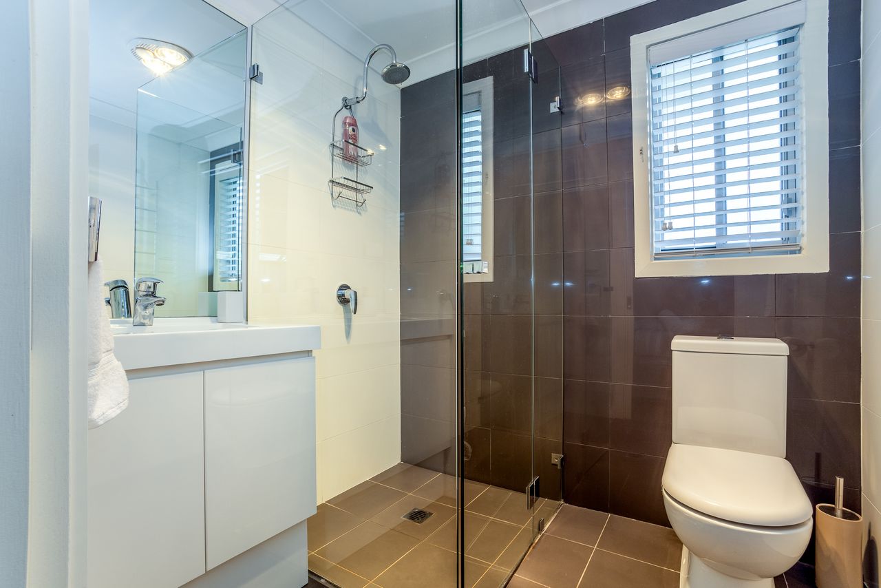 The front door opens directly into downstairs living area with sofa, Smart TV (BYO Netflix etc.), DVD player, children's DVDs, books and games. There are three bedrooms downstairs, the master bedroom with king bed, walk in robe and ensuite, and Bedroom Two and Three with two king single beds in each room. There are two bathrooms: one ensuite bathroom to master bedroom with shower, vanity and toilet, and one spacious master bathroom with bath, shower, vanity and toilet, and a separate powder room.