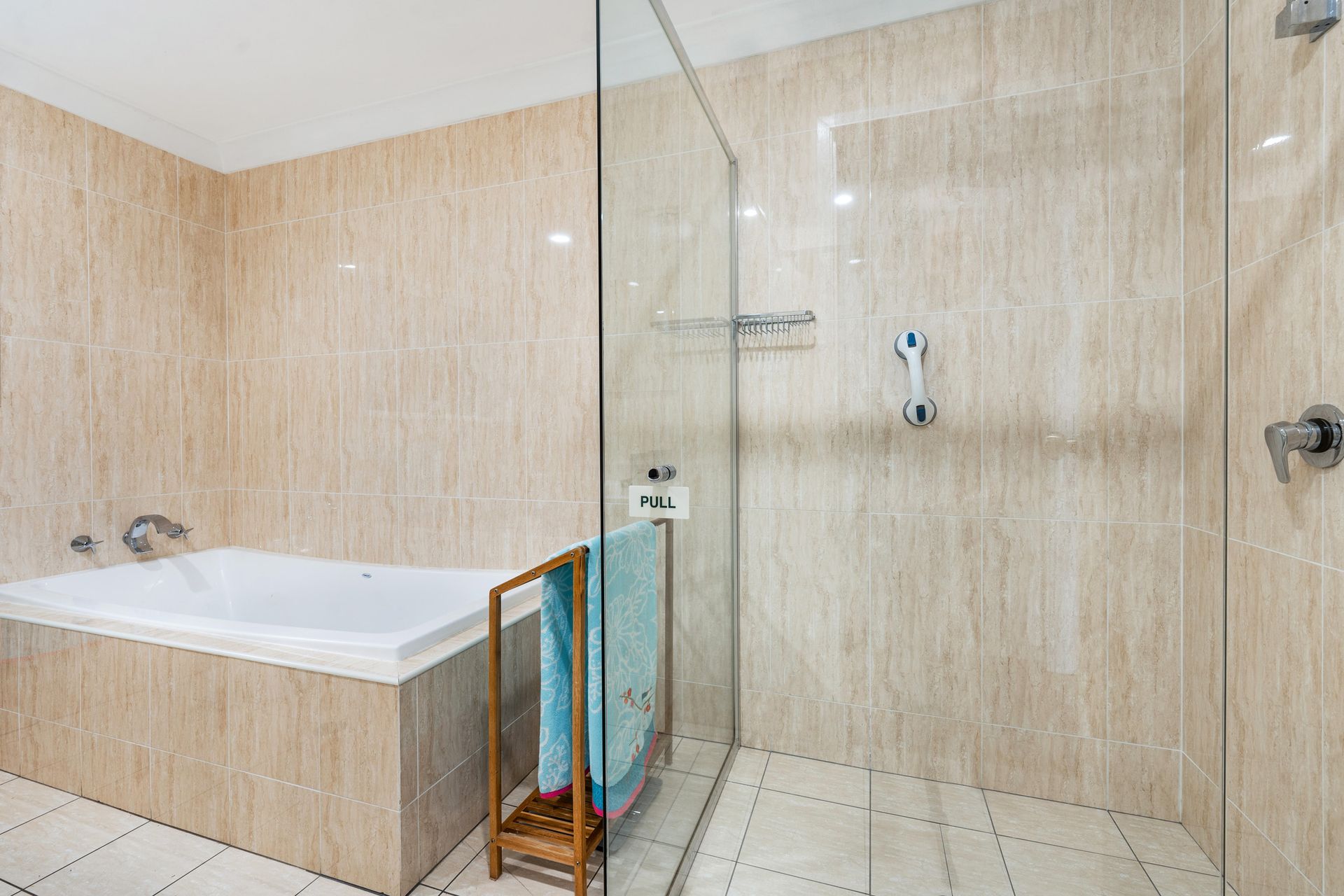 One queen bedroom; built in wardrobe. Large modern bathroom; floor to ceiling tiles; large separate bathtub; generous shower recess; vanity and toilet; hairdryer provided. Modern Kitchen on the ground floor - well equipped, kitchen with splash back, electric cook top, oven, microwave, kettle, toaster, dishwasher and fridge. There are two decks downstairs.