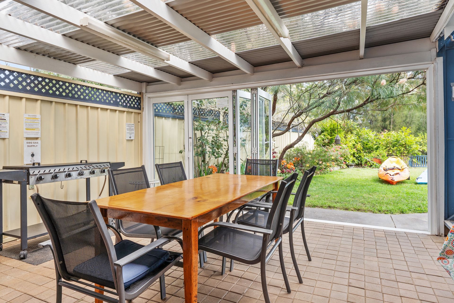 The sunroom entertainment area has a gas BBQ and fold back doors to let the outside in and the kayaks out
