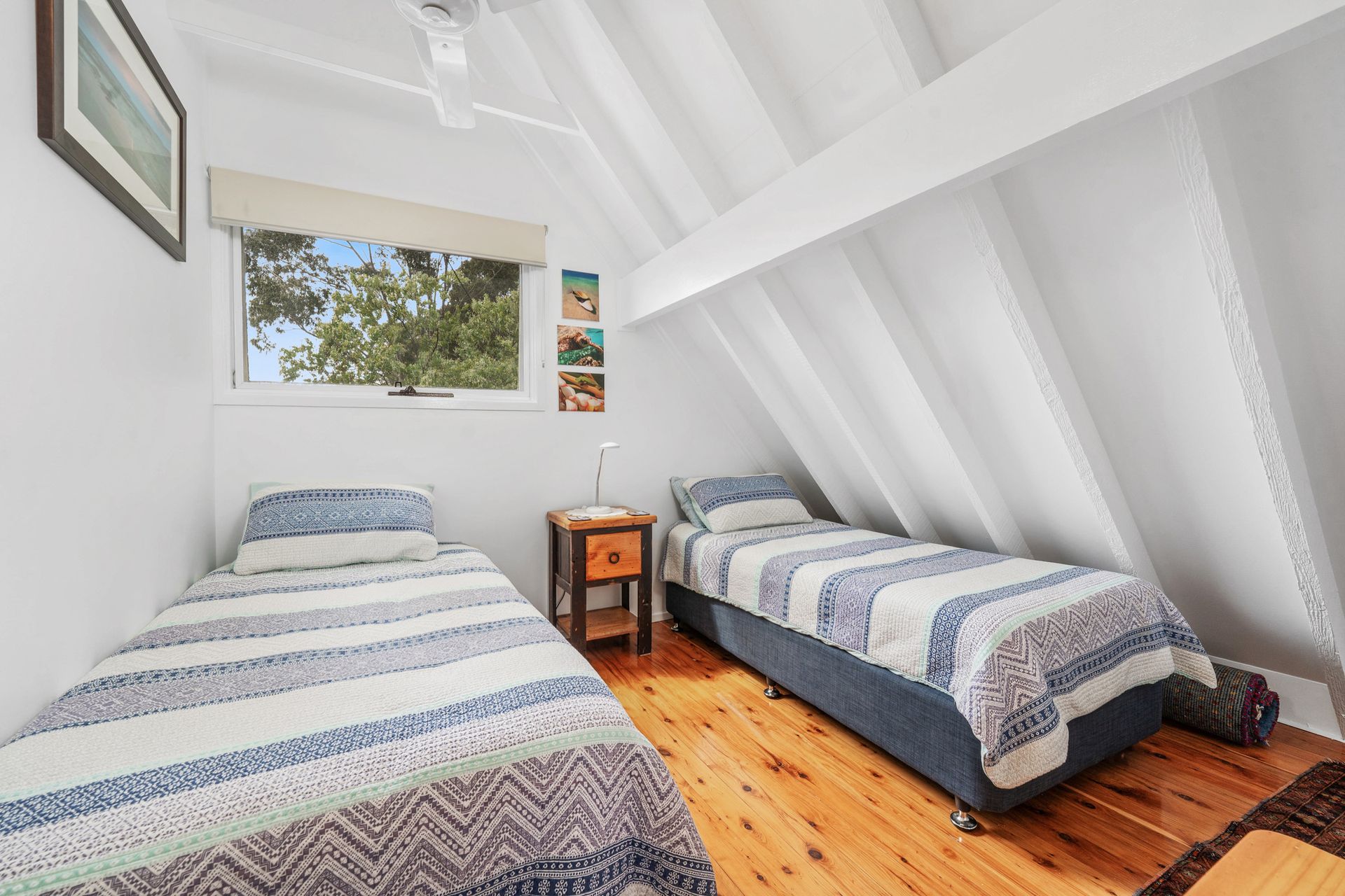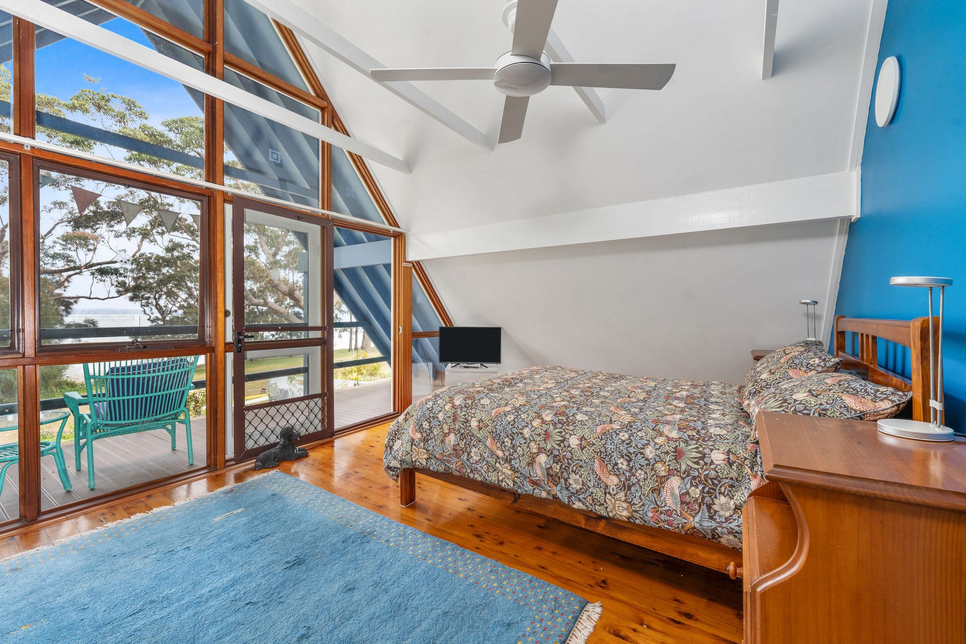 The spacious master bedroom with queen bed, built-in wardrobe, small TV and balcony overlooking the lake, with a cat-door leading out to the balcony. Another queen bedroom and a smaller bedroom with two single beds.