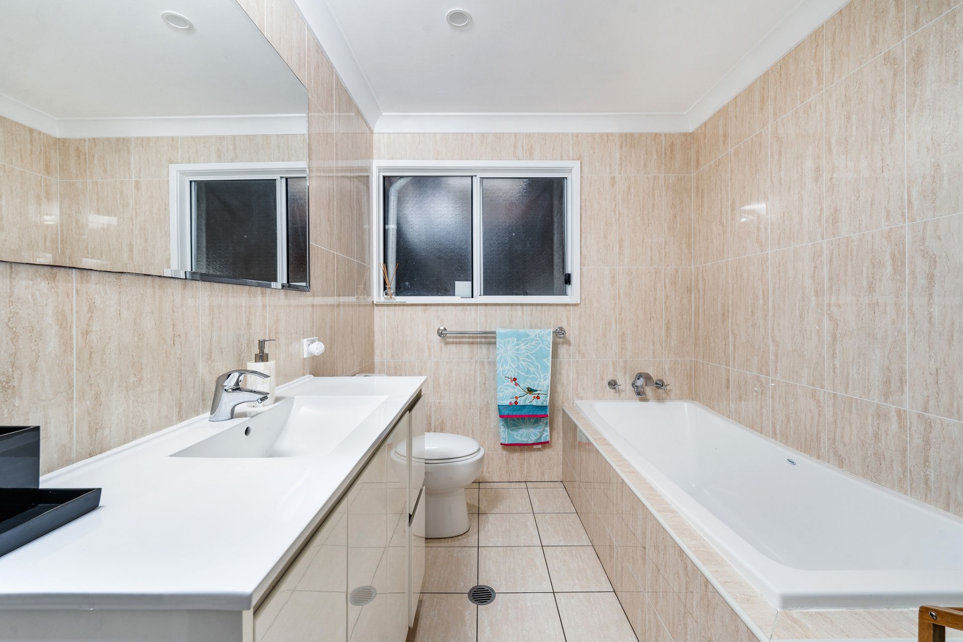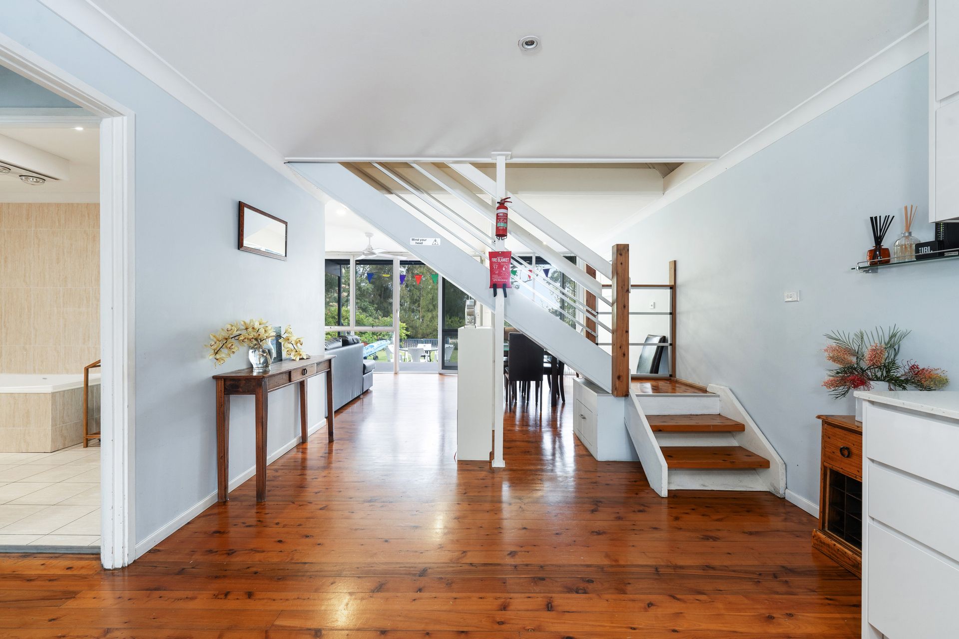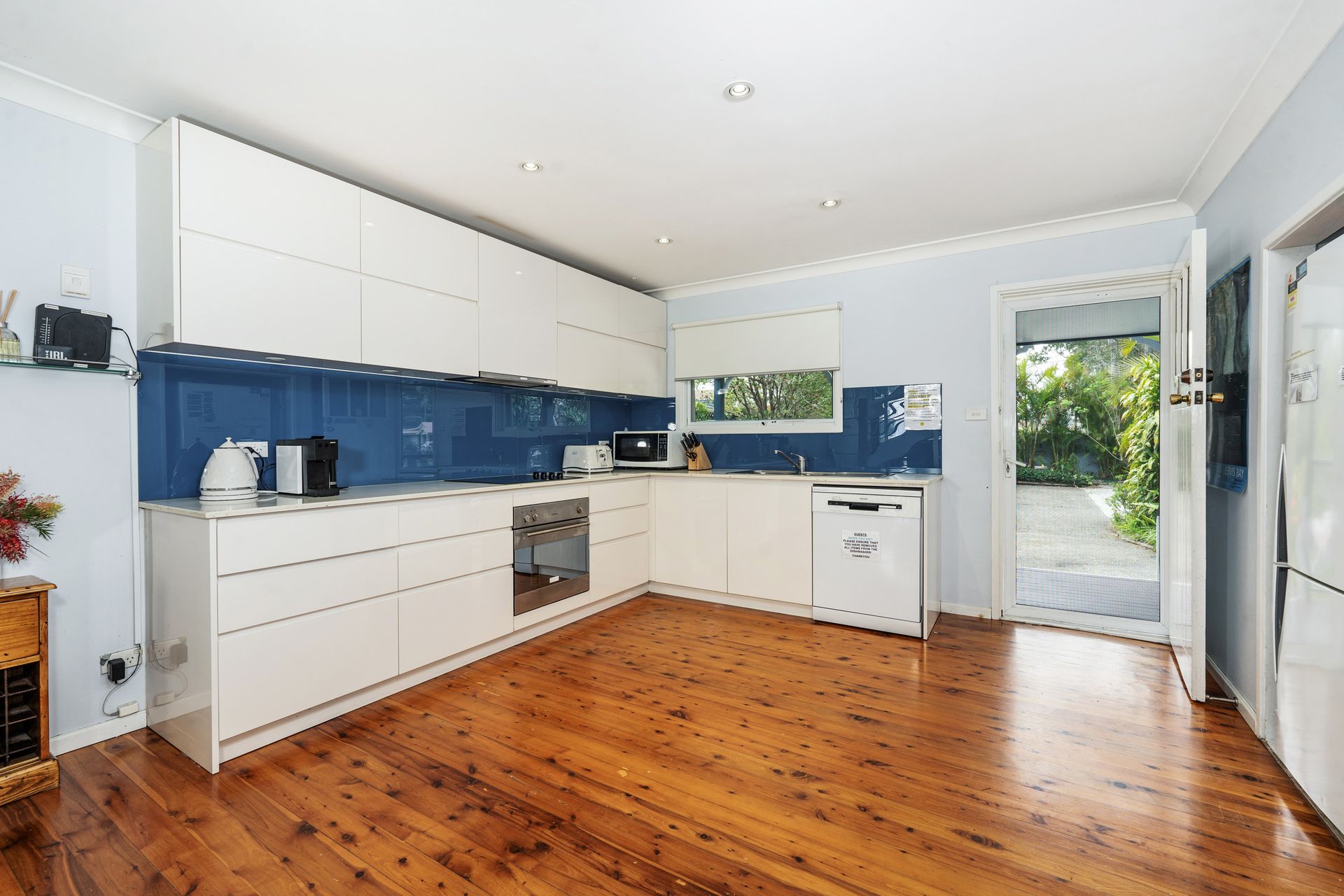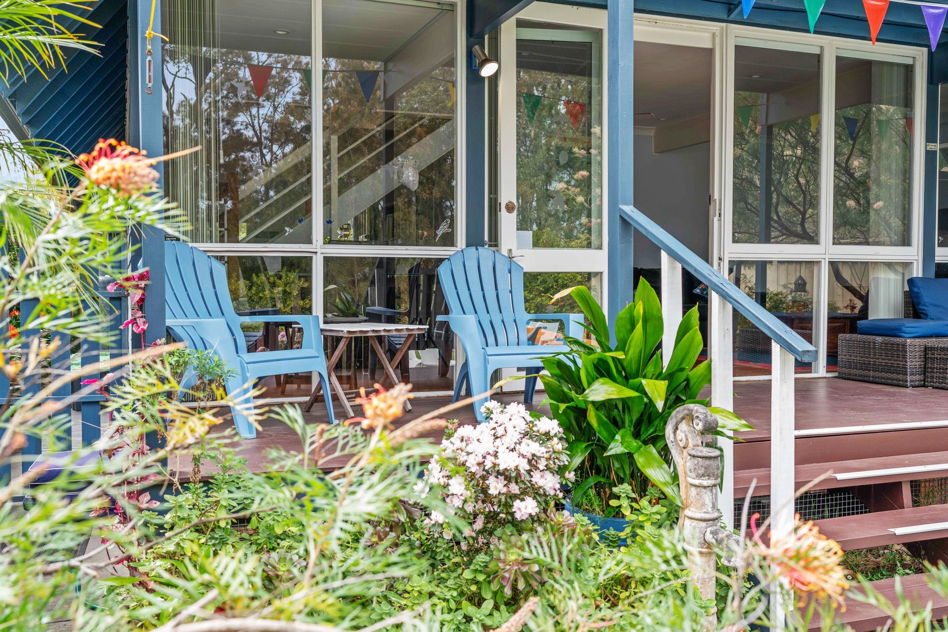 On the roadside entry to the property there is a walled-in tropical garden and circular driveway providing security and privacy. This area is ideal for dogs as the fences are very high. On the lake side, the garden has a lower fence and a gate opening to the reserve/lake, and a walking / bike track which goes for kilometres. There is a lake side deck looking out towards the water with a comfortable outdoor lounge setting, table and chairs. Sunroom / BBQ Area - There is newly renovated smaller bathroom with a vanity, shower and toilet; ideal for use after swimming in the lake.