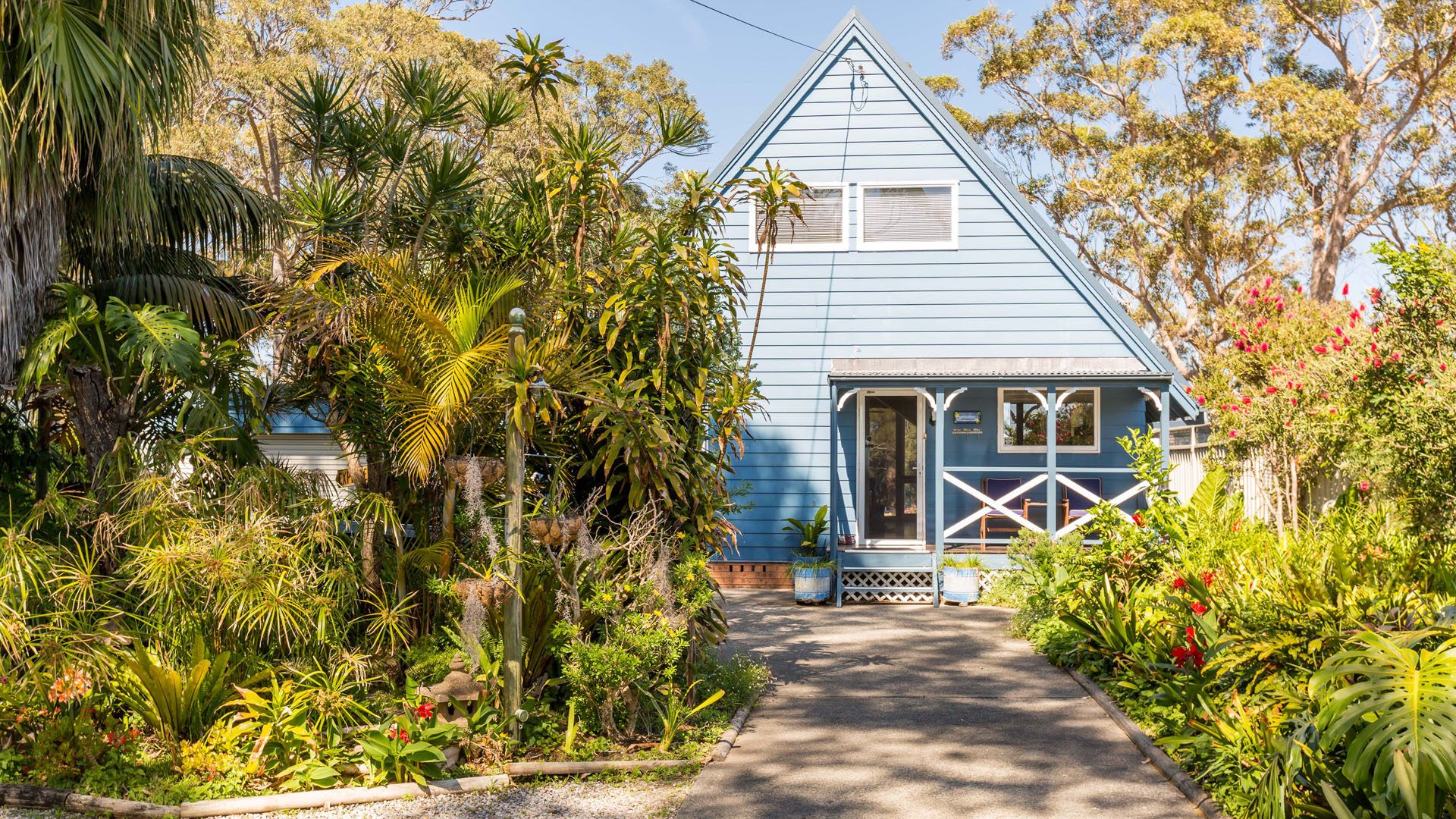 Two storey A-frame, renovated, comfy cottage. WiFi, aircon, kayaks, decks, tropical garden, and lake views. An affordable home away from home for family & pets