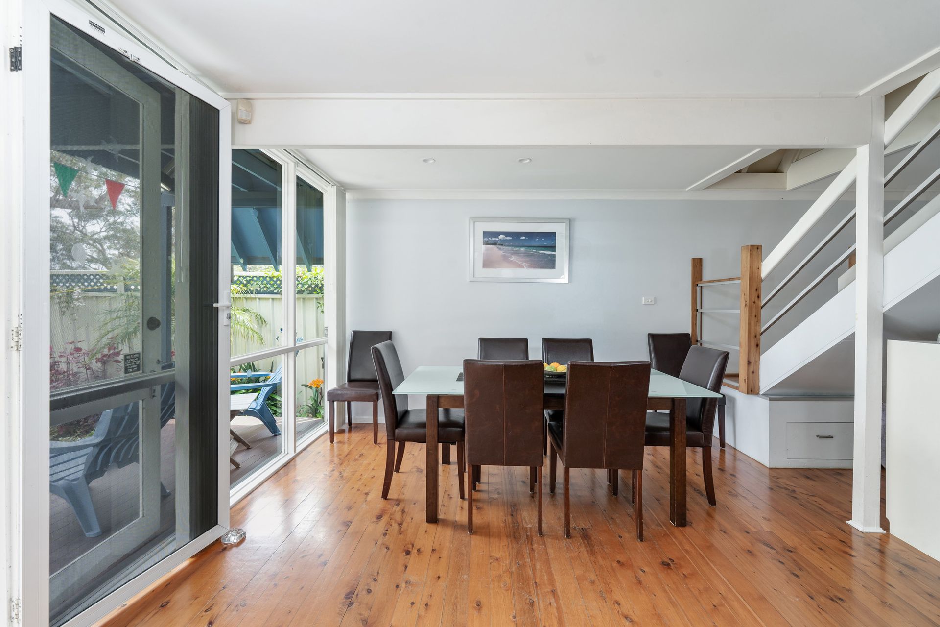 A combined, timber-floored dining and lounge room with WIFI, leather chaise lounge; TV, DVD player, DVDs, games, Large dining table, extra chairs. This area looks out to the deck and the lake. Upstairs: Three more bedrooms and a bathroom with toilet and basin.