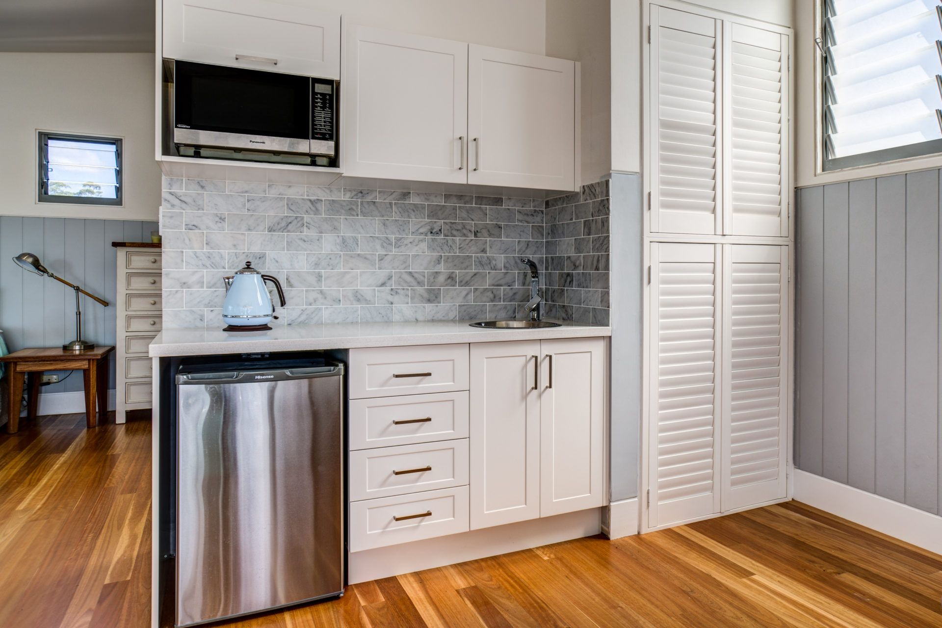 Upstairs you will find a spacious adult's retreat, complete with king bed, kitchenette and a bathroom. There is also a large private deck with a lounge area.
