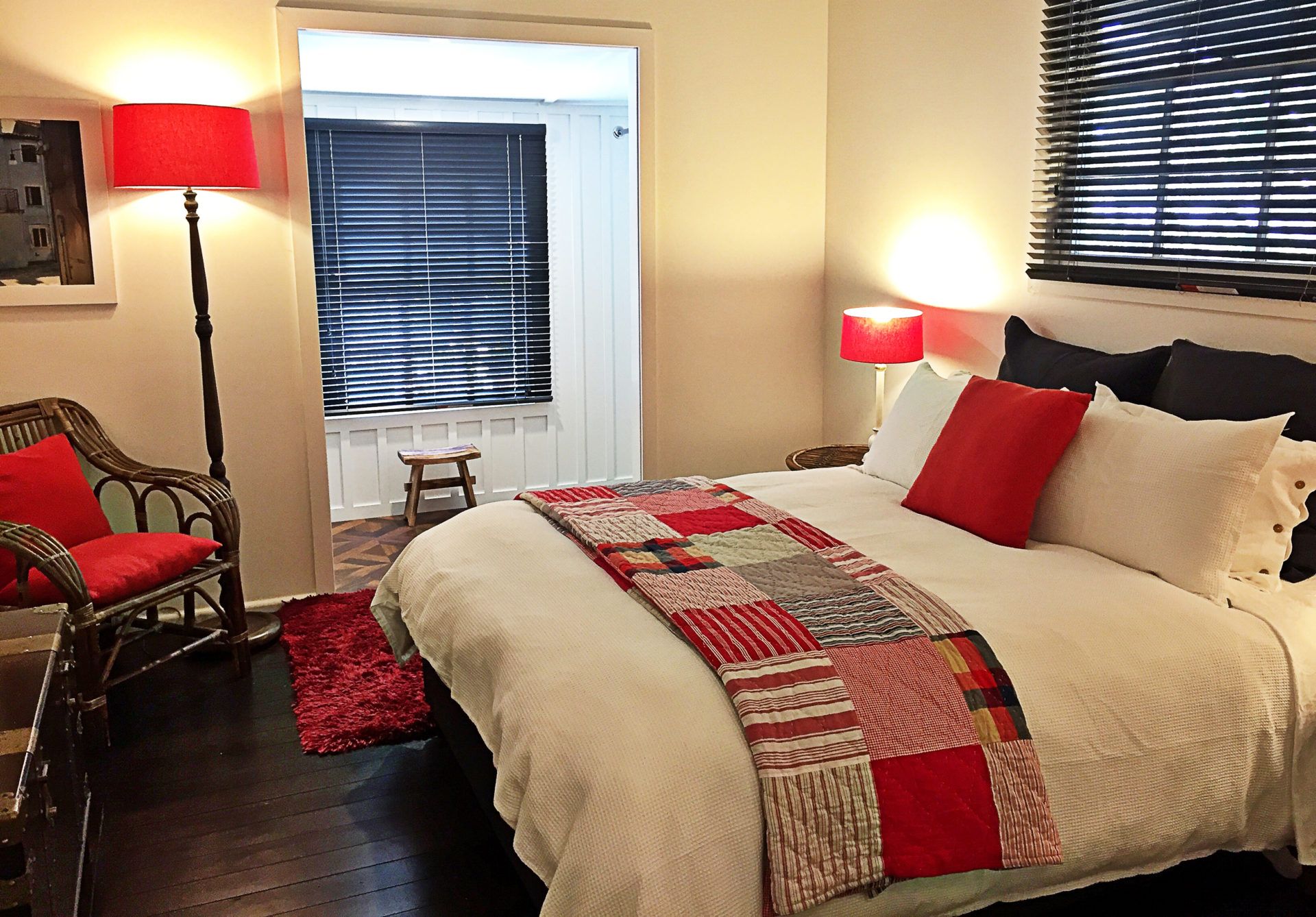 This spacious studio sits beside the pond with serene views across the neighbouring lake. It has a queen bed and a single sofa bed, as well as a funky bathroom and kitchenette.
