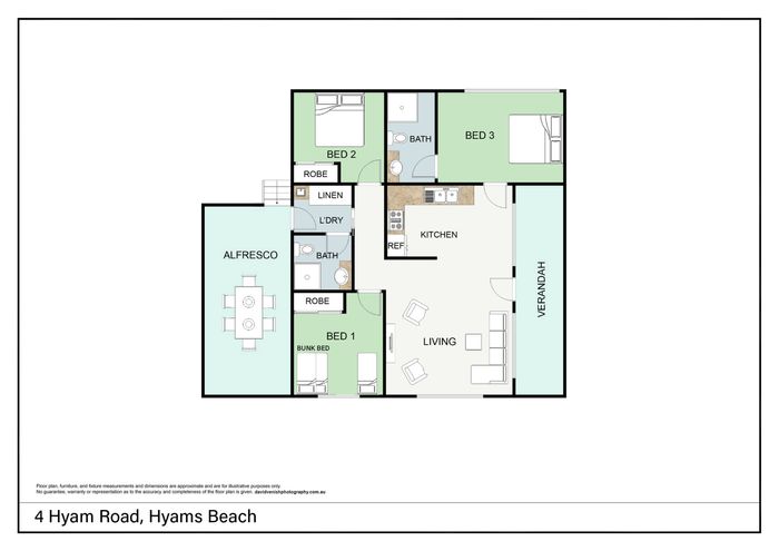 Moby's at Hyams is a single level house. The front door is sheltered by the front verandah, and leads into an open plan kitchen, living and dining area. A master bedroom has its own ensuite and two other bedrooms share a second bathroom. An internal laundry leads to the rear deck.
