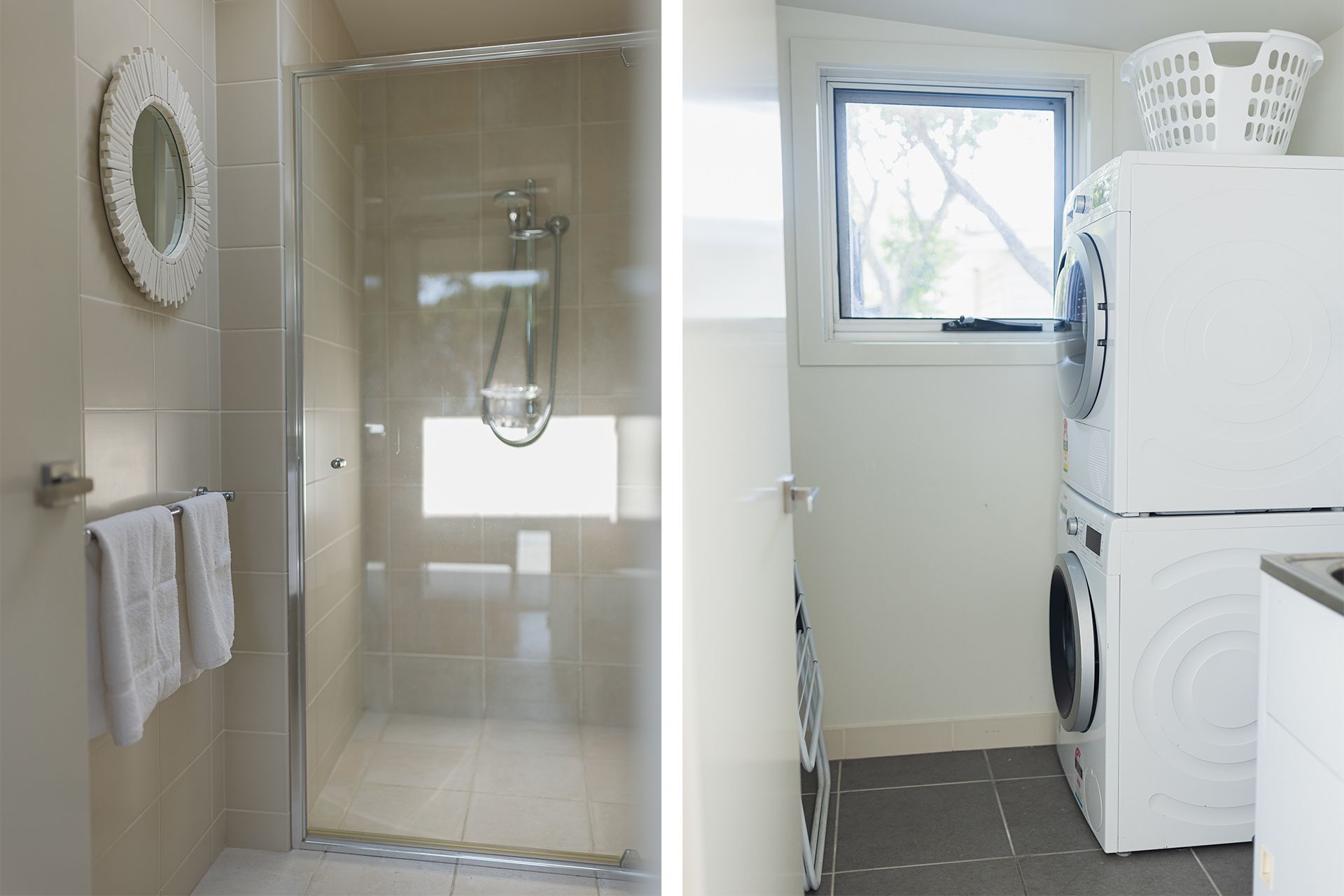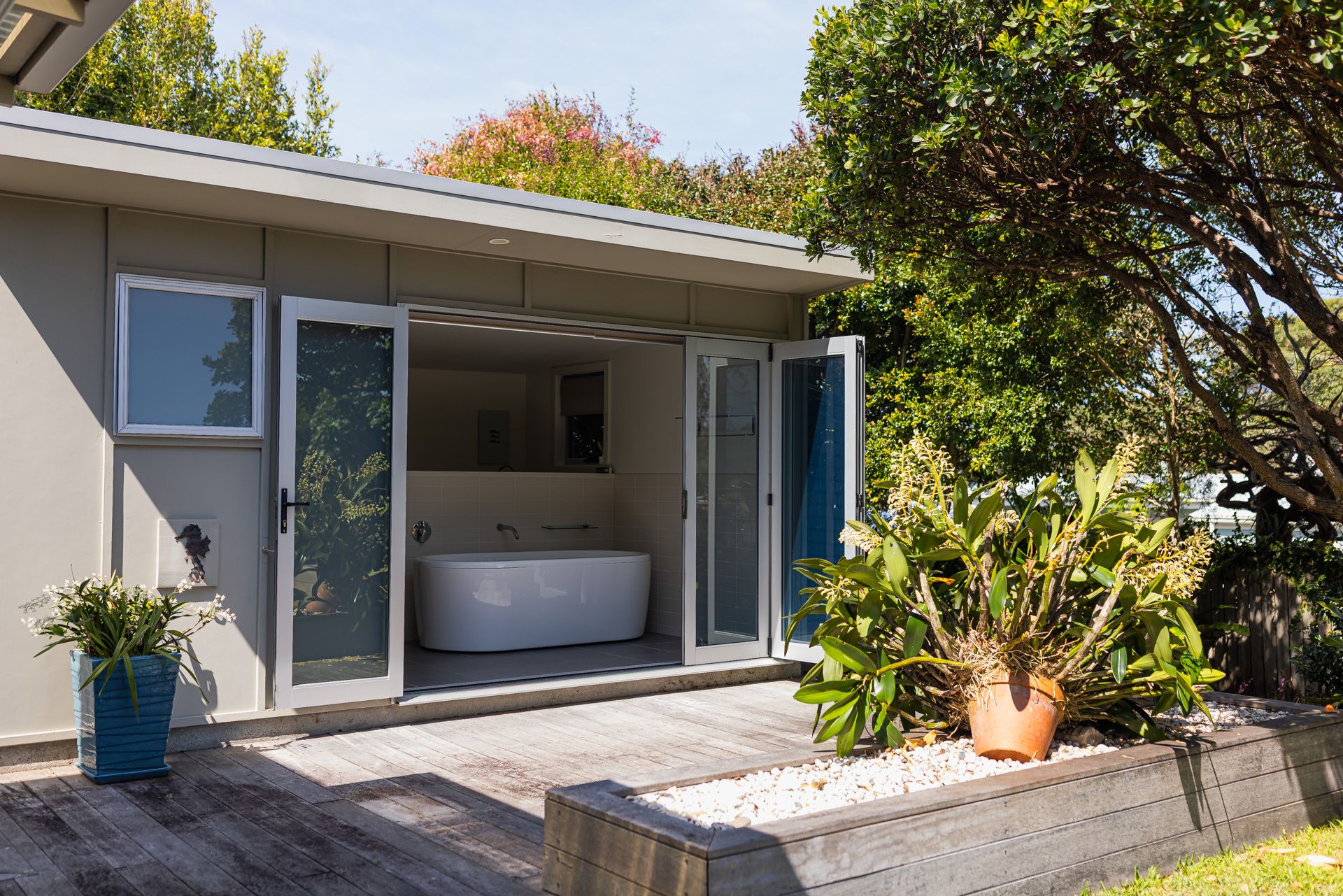 There is a luxurious bath-house, with a bath tub big enough for two people connected to the house via a deck. There is also a toilet and shower located in the bathhouse. The laundry can also be found here. There is an outdoor shower for rinsing off after the beach.