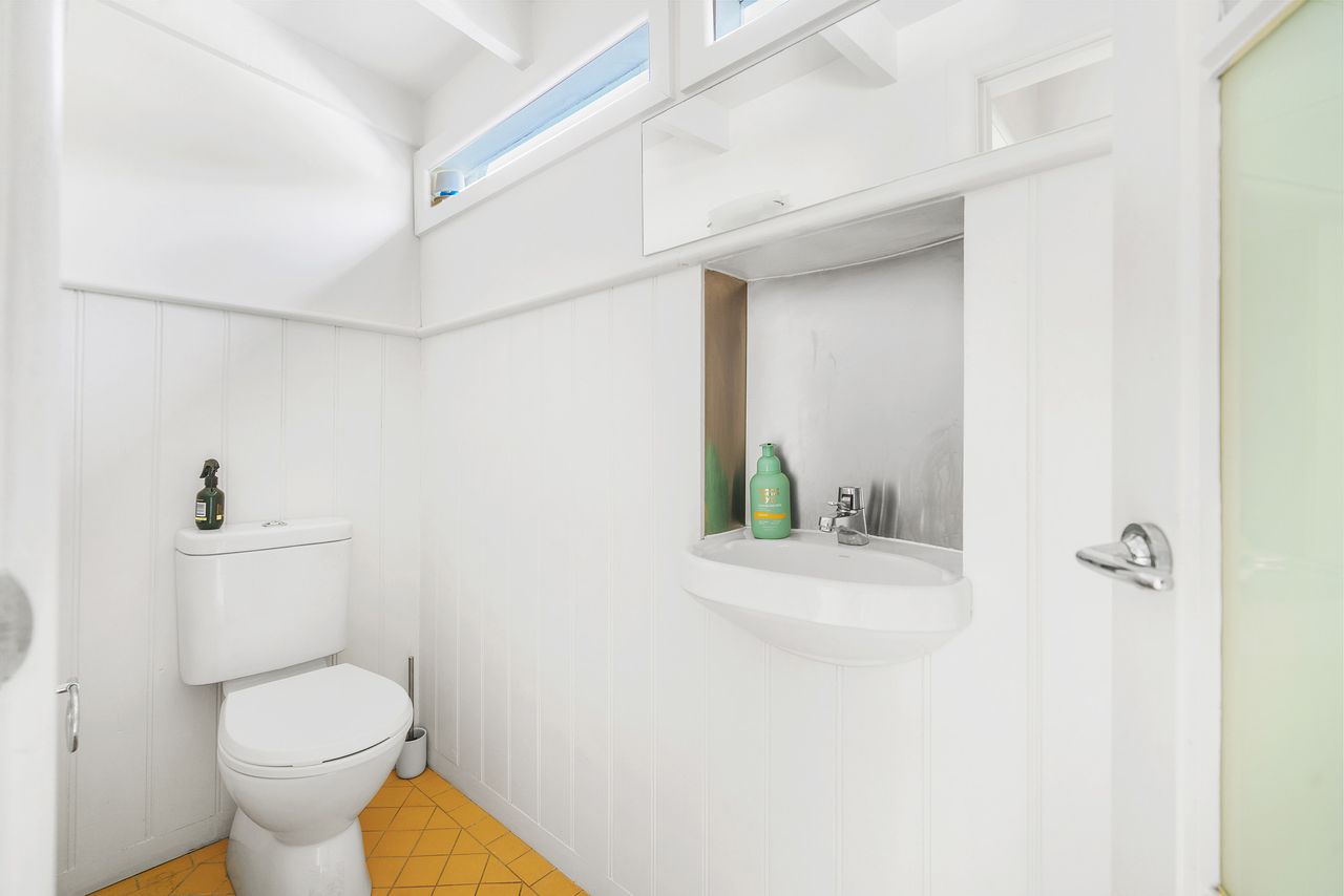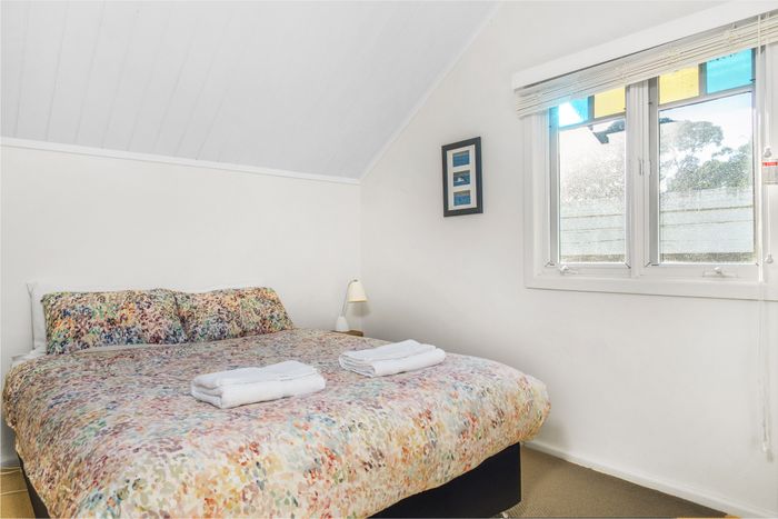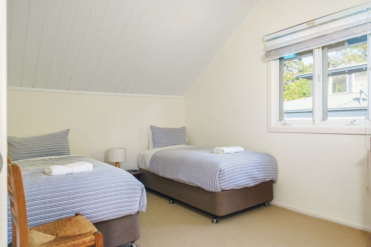 The downstairs layout of the house provides for two living areas opening to the front and back decks, a dining area, the kitchen, a shared bathroom, an internal laundry and a good sized bedroom with French doors that open onto the deck. Upstairs has two bedrooms - one with a queen bed and one with two single beds. There is also a toilet upstairs.
