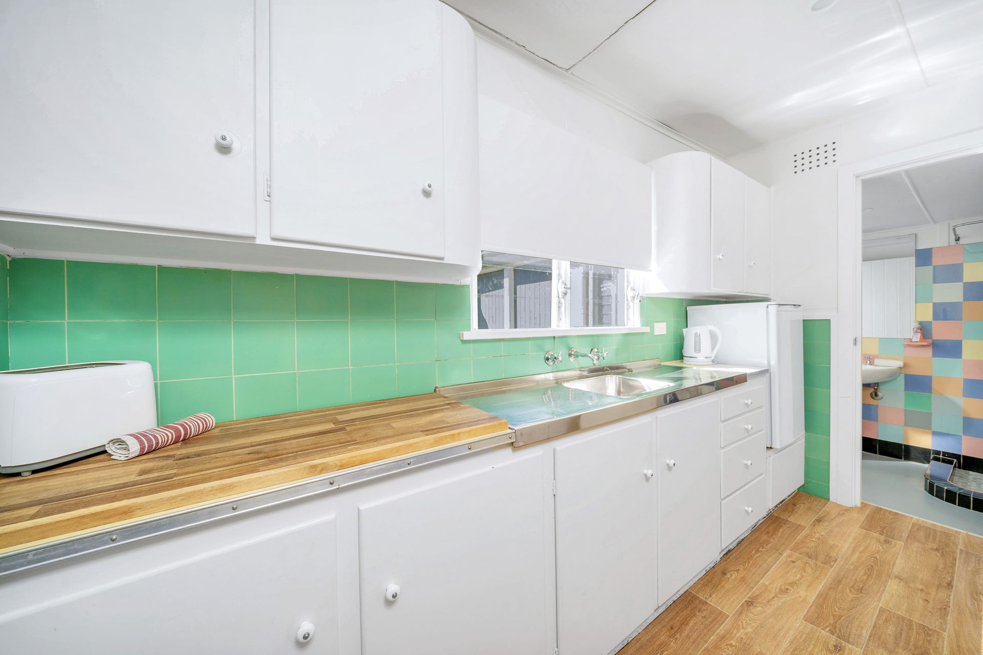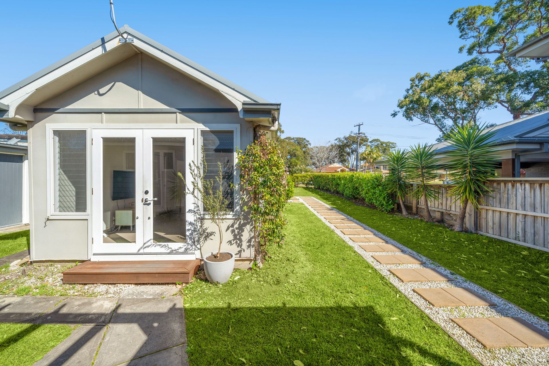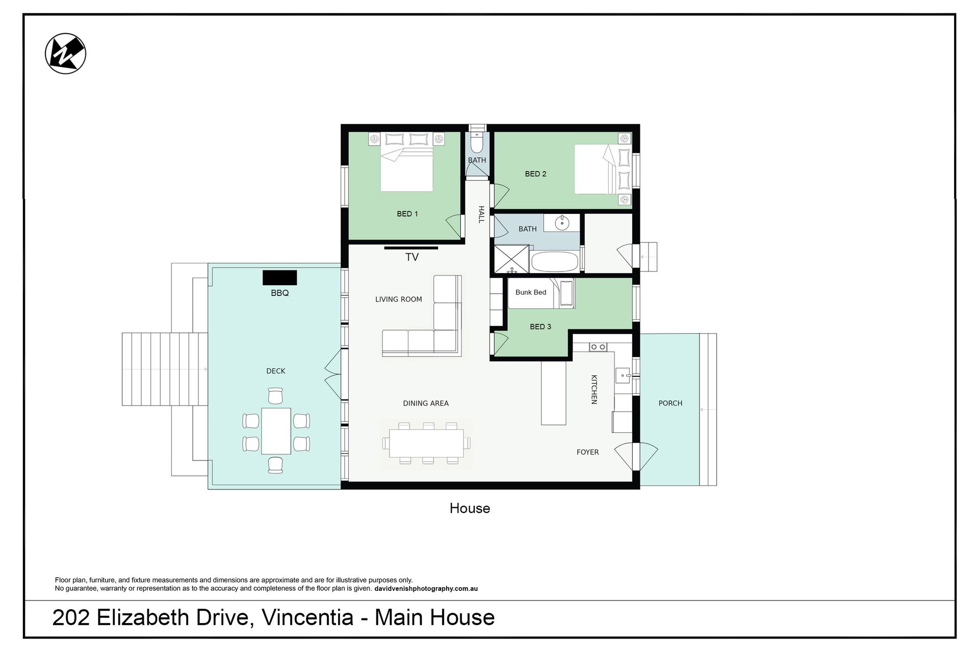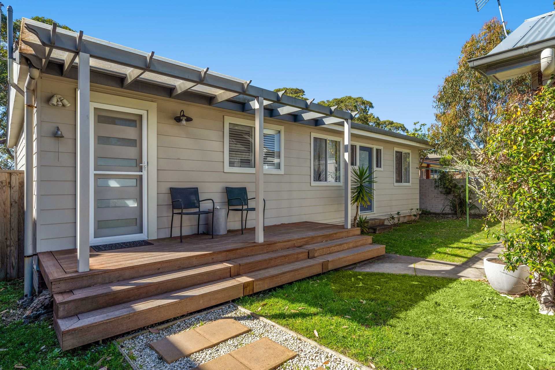 The main house is a single storey design and opens onto a lovely deck with fantastic views of Jervis Bay. There is a large open plan area that takes in the kitchen, dining and a comfy TV lounge. Three bedrooms connect to the living area via a hallway - the master bedroom with water views and a queen bed, a second queen bedroom, and a third kids' room with bunk beds. All bedrooms share a common bathroom with shower and bath, and there is a separate toilet.
