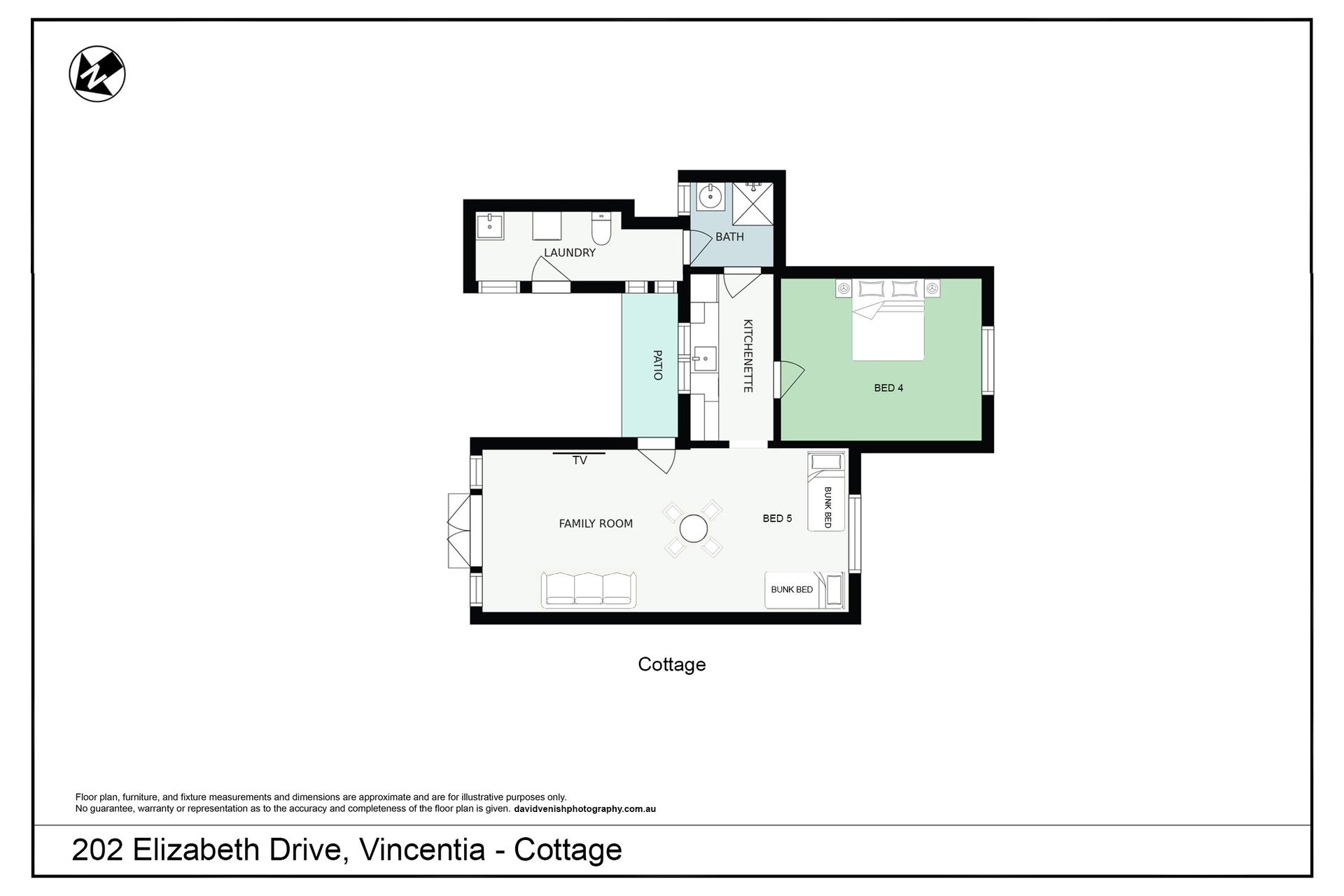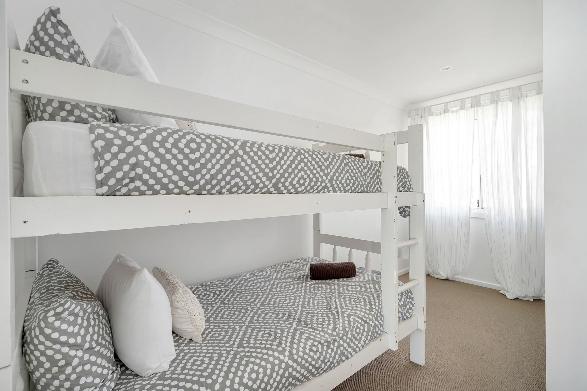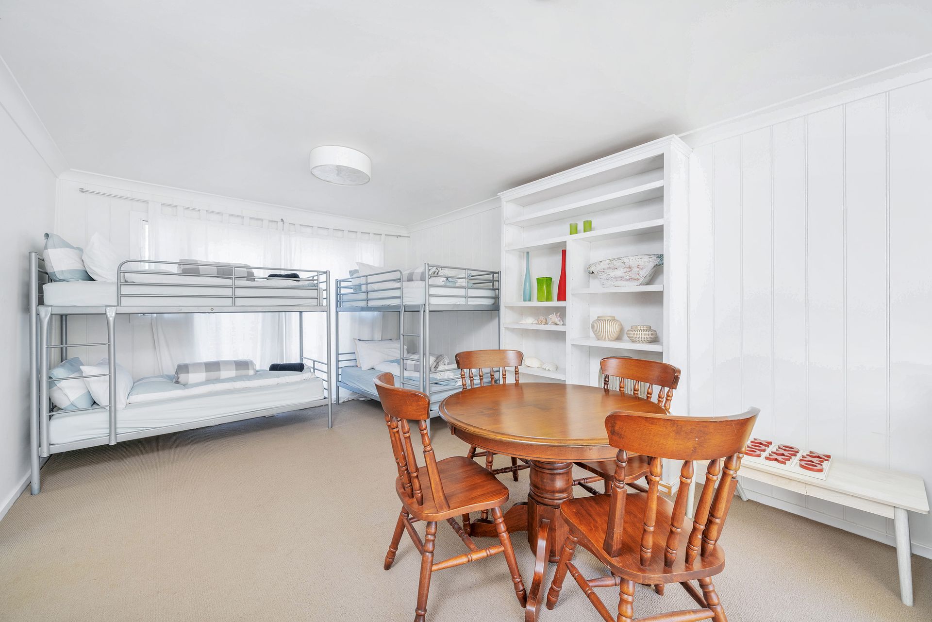 The detached annexe has a very large living area with 2 bunk beds and a fourth bedroom with a queen bed, a small kitchenette, a shower and toilet, and a connected internal laundry. The configuration of the annexe allows the kids to enjoy the bunk beds and living area, whilst Mum and Dad can have their own space in the separate bedroom.