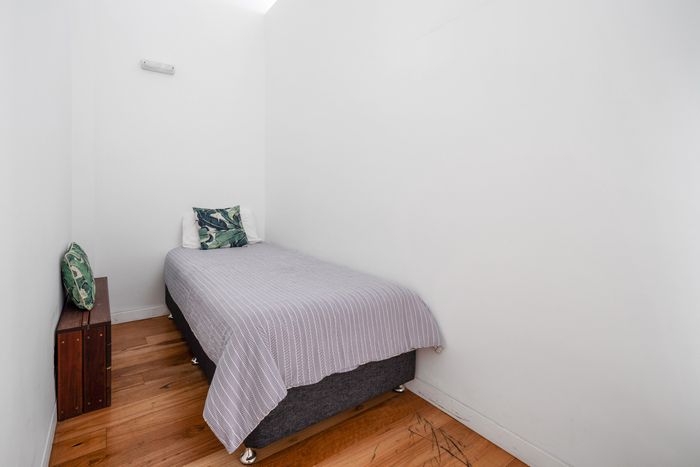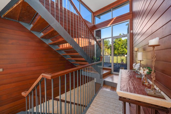 The second level is divided into two sections, divided by the staircase atrium. To the right, the larger wing contains an open plan kitchen, dining and living area which serves as the hub of the home. Leading off from this area you will find two more bedrooms (one with a king bed and a single bed behind a dividing wall; and the second bedroom with a queen bed. There is also a shared bathroom and European style laundry on this level. At the front of the house to the ocean, and to the rear of the house to the garden - the living, kitchen and bedrooms open to timber decks. The rear deck has a gas BBQ and fenced non-heated plunge pool. The rear deck steps down to a lawn area which is fully fenced on all sides.