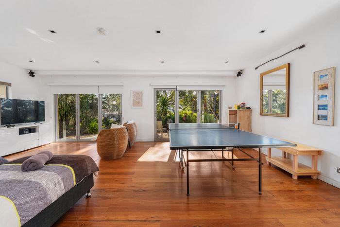 On the ground floor, you enter into a generous atrium containing a staircase that connects all levels of the house. To the left is a double lock up garage that is made available for guest use. To the right, double doors open into a large rumpus room complete with second kitchen, a table tennis table and 3 beds: 1 x king single and 2 x singles. Connected by a hallway are two bedrooms - one queen and one with 2 x king single beds - as well as a shared bathroom for this level of the house.