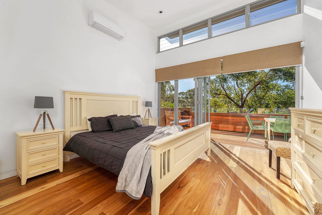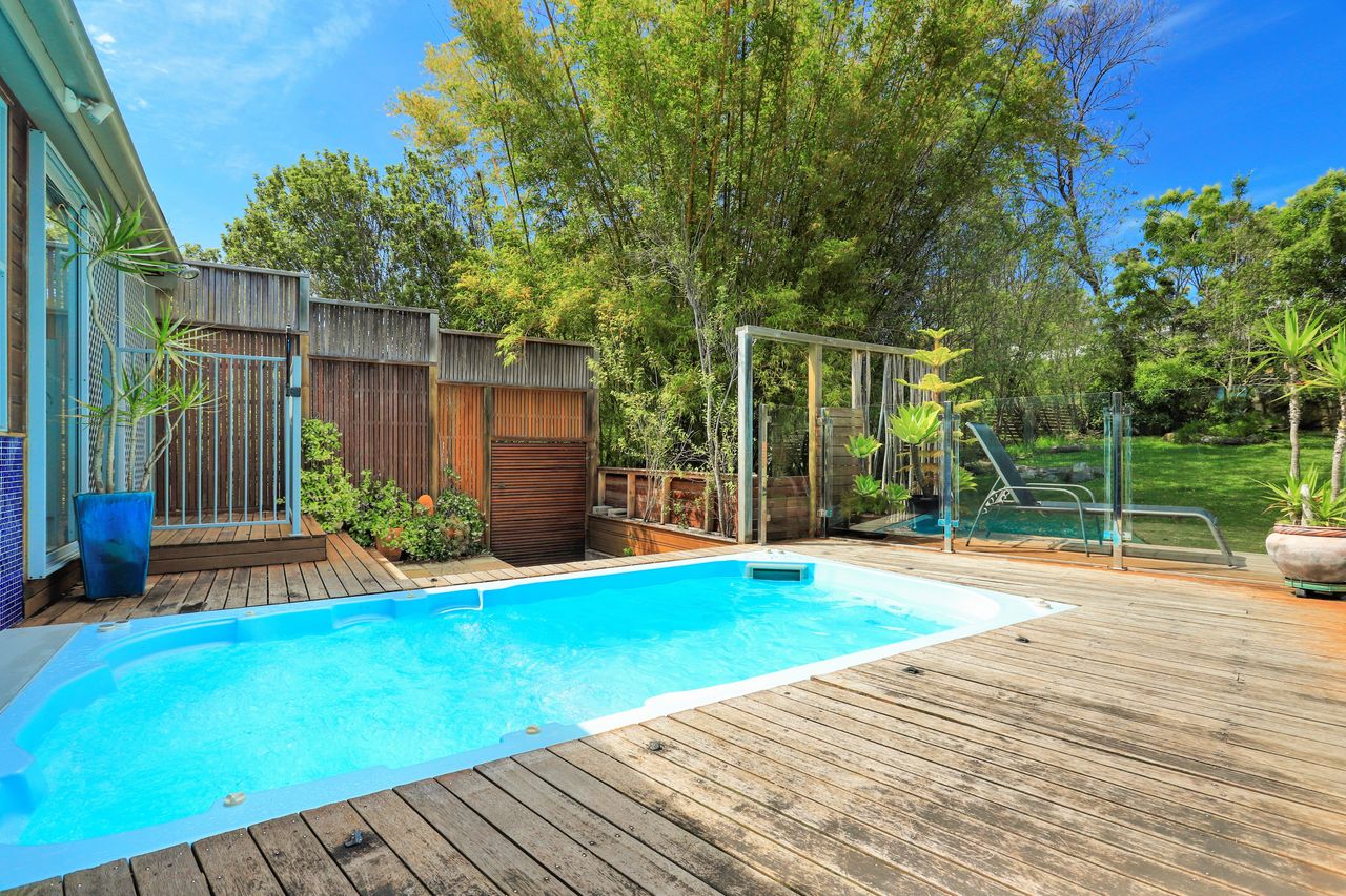 The second level is divided into two sections, divided by the staircase atrium. To the right, the larger wing contains an open plan kitchen, dining and living area which serves as the hub of the home. Leading off from this area you will find two more bedrooms (one with a king bed and a single bed behind a dividing wall; and the second bedroom with a queen bed. There is also a shared bathroom and European style laundry on this level. At the front of the house to the ocean, and to the rear of the house to the garden - the living, kitchen and bedrooms open to timber decks. The rear deck has a gas BBQ and fenced non-heated plunge pool. The rear deck steps down to a lawn area which is fully fenced on all sides.