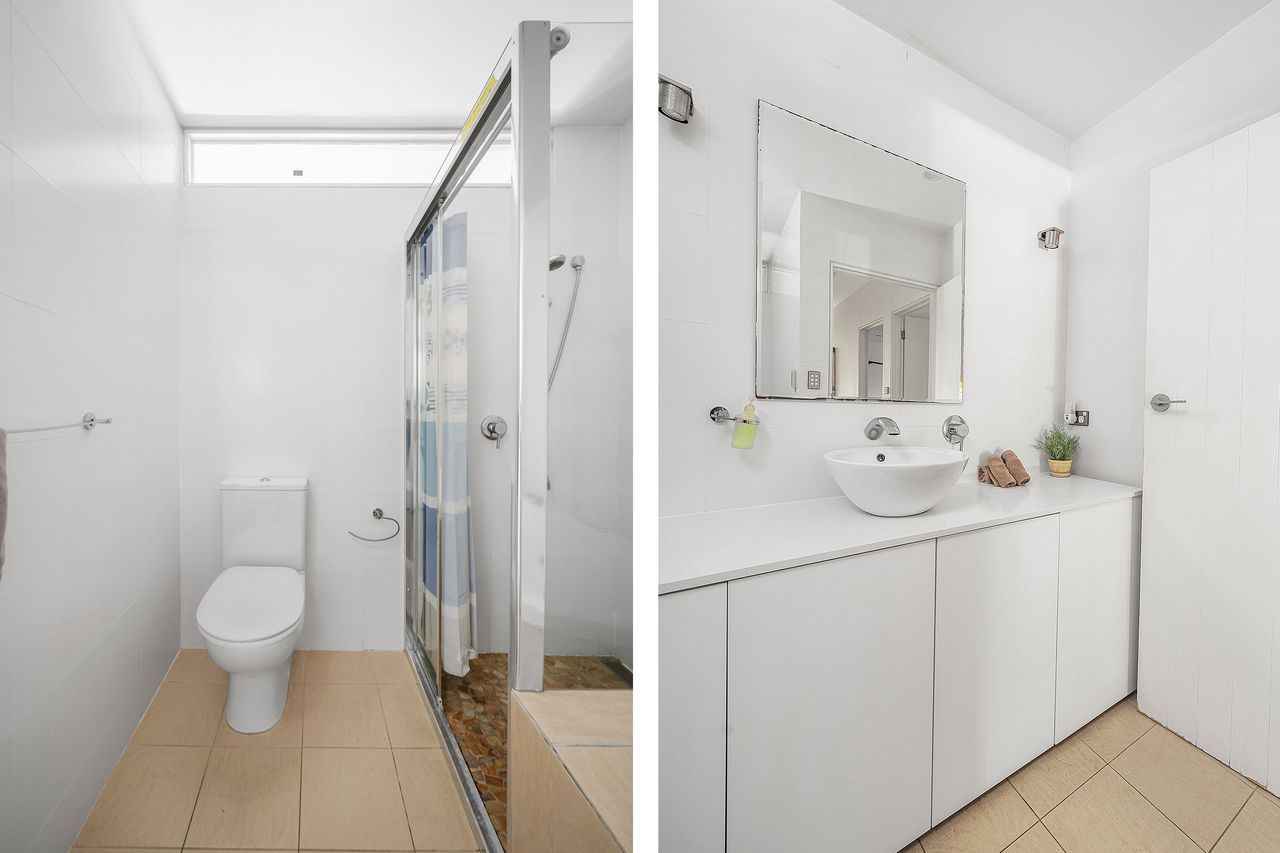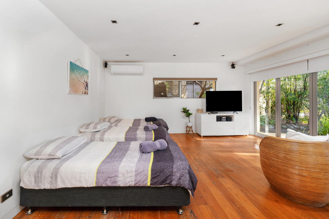 On the ground floor, you enter into a generous atrium containing a staircase that connects all levels of the house. To the left is a double lock up garage that is made available for guest use. To the right, double doors open into a large rumpus room complete with second kitchen, a table tennis table and 3 beds: 1 x king single and 2 x singles. Connected by a hallway are two bedrooms - one queen and one with 2 x king single beds - as well as a shared bathroom for this level of the house.