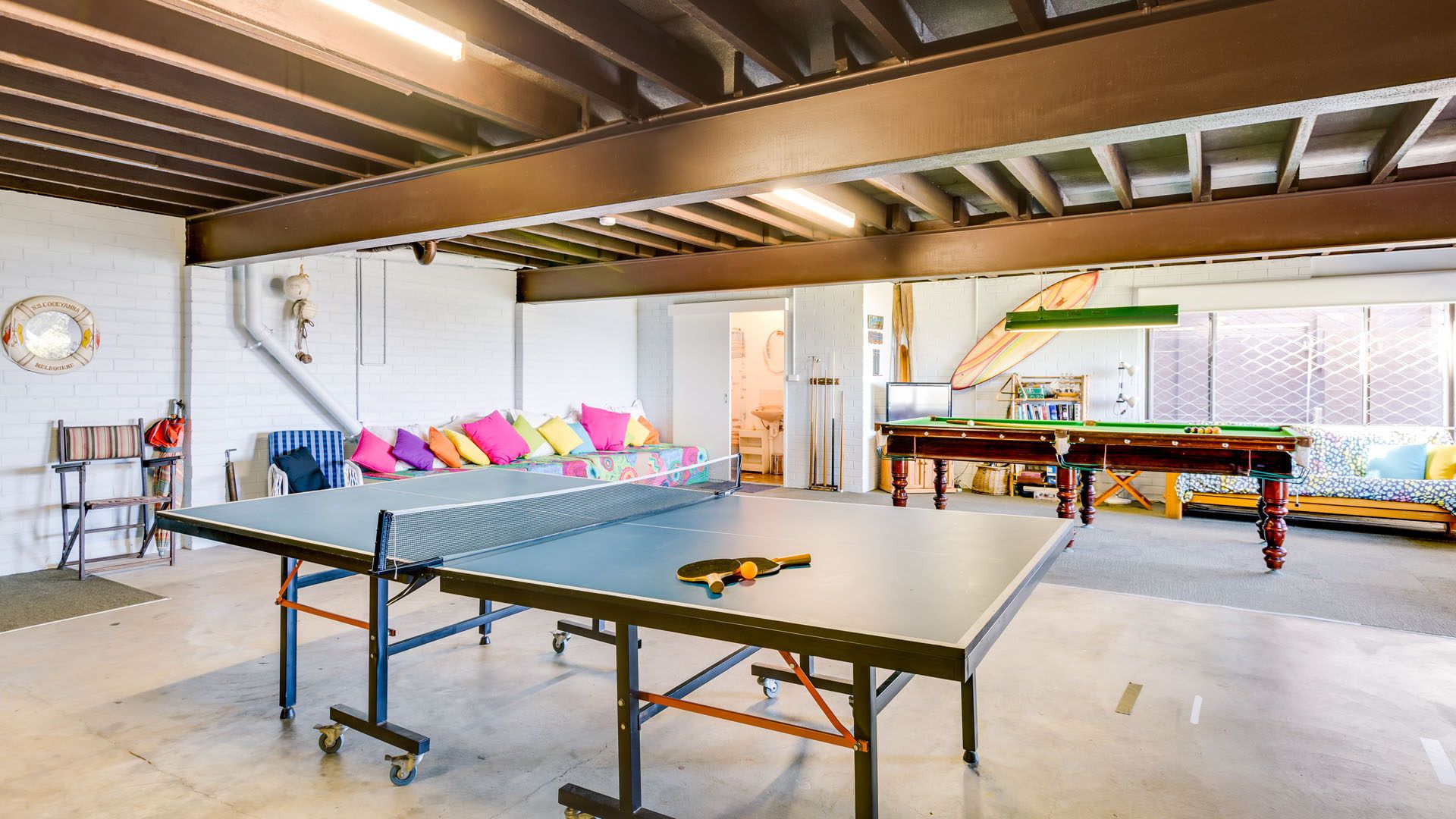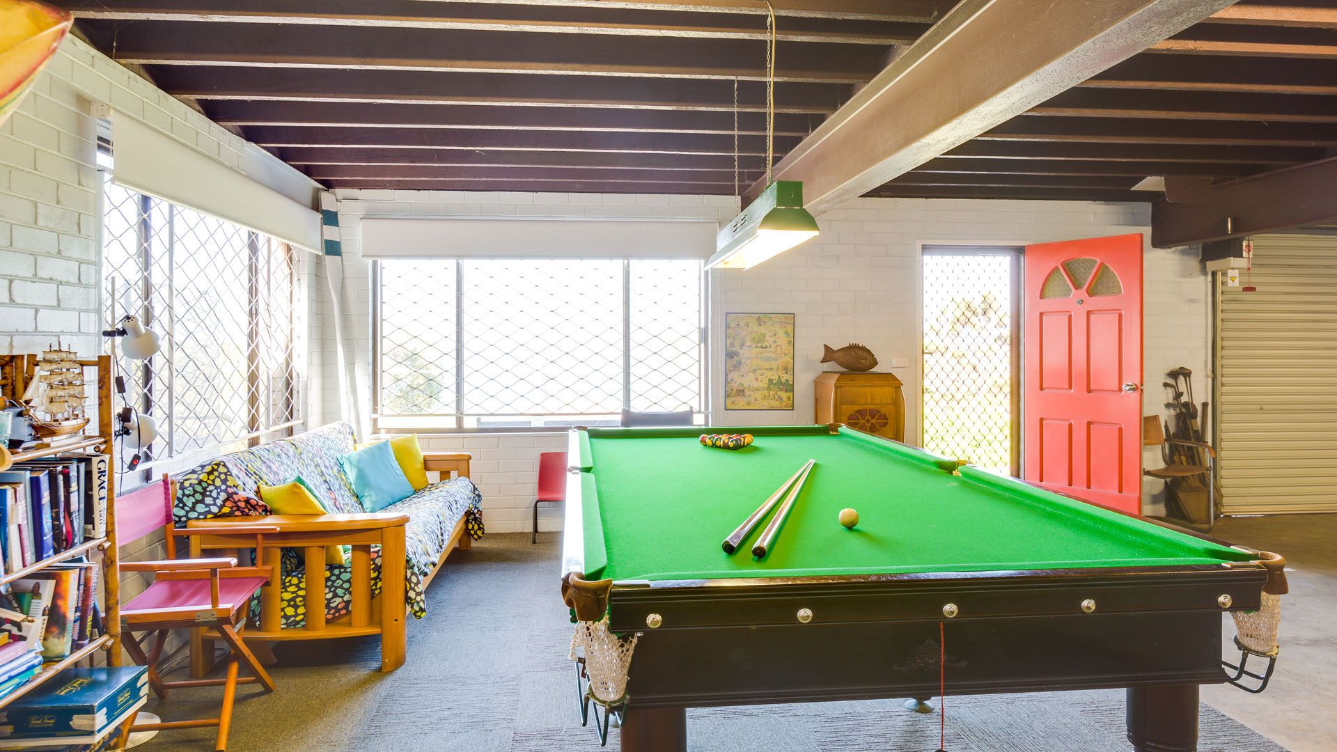 Osprey is a two storey family home with terraced front gardens. On the entrance level is the garage which has been converted to a games room with billiard table, table tennis table, TV, books and games. There is also a compact bathroom with shower, vanity and toilet. Upstairs there are three bedrooms, one with a queen bed, and the others with two single beds. There is one bathroom with bath, shower, vanity and separate toilet.