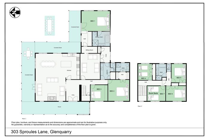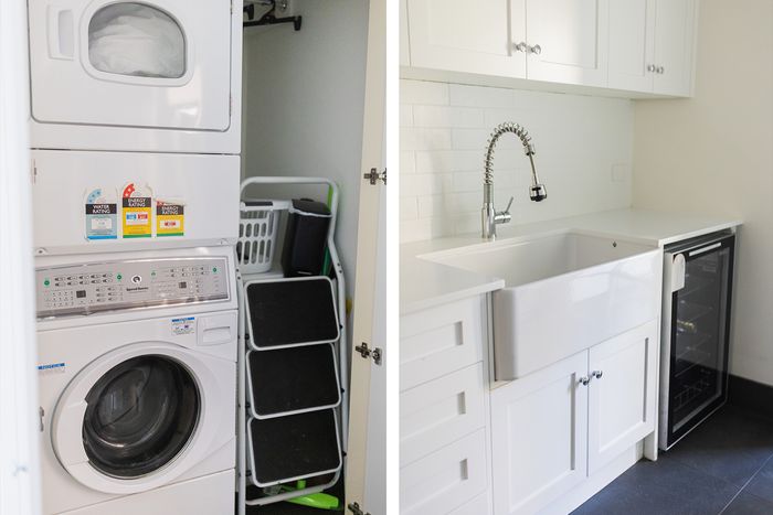 The bedrooms are all located to the right of the entrance. Downstairs is the master with king bed and ensuite including bath, a second bedroom with king bed, and a third bedroom with a queen bed. The laundry and mudroom are also downstairs. Upstairs has four additional bedrooms upstairs and a shared bathroom. The bedrooms upstairs are 2 king bedrooms, a room with 2 king singles, and a bunk room with 2 bunk beds sleeping 4 guests. The shared bathroom has a shower and bath, and there is a separate toilet.
