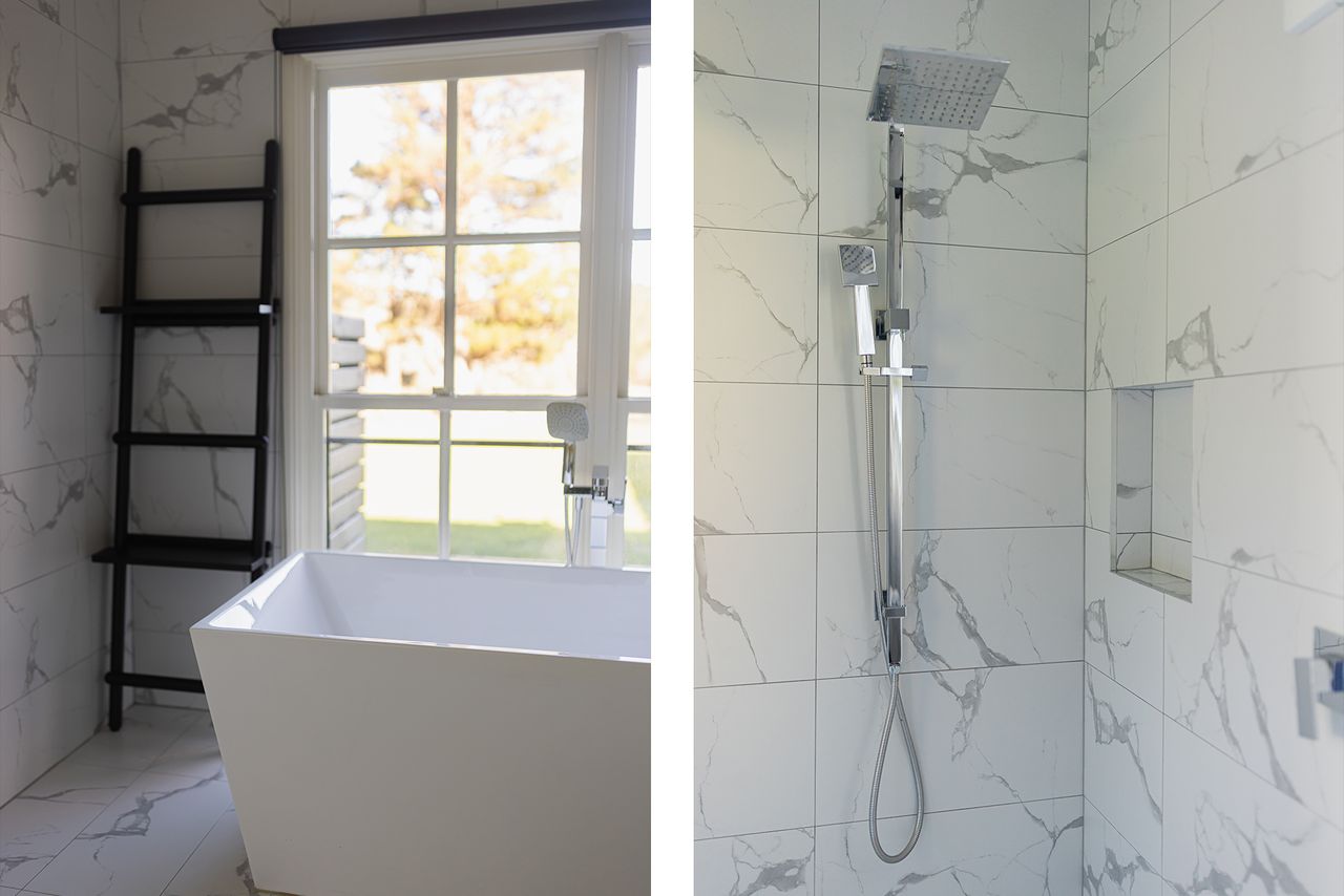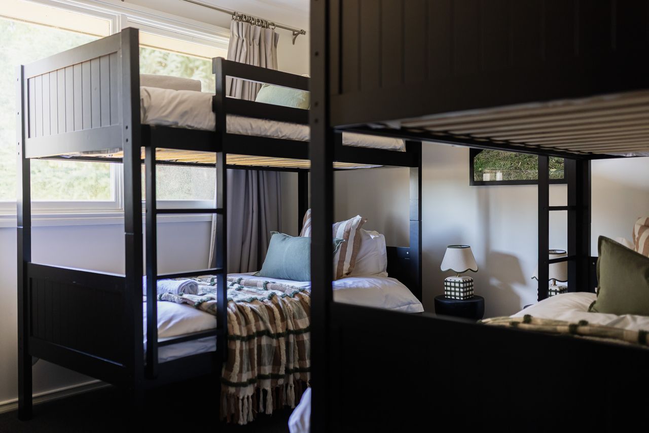 The bedrooms are all located to the right of the entrance. Downstairs is the master with king bed and ensuite including bath, a second bedroom with king bed, and a third bedroom with a queen bed. The laundry and mudroom are also downstairs. Upstairs has four additional bedrooms upstairs and a shared bathroom. The bedrooms upstairs are 2 king bedrooms, a room with 2 king singles, and a bunk room with 2 bunk beds sleeping 4 guests. The shared bathroom has a shower and bath, and there is a separate toilet.