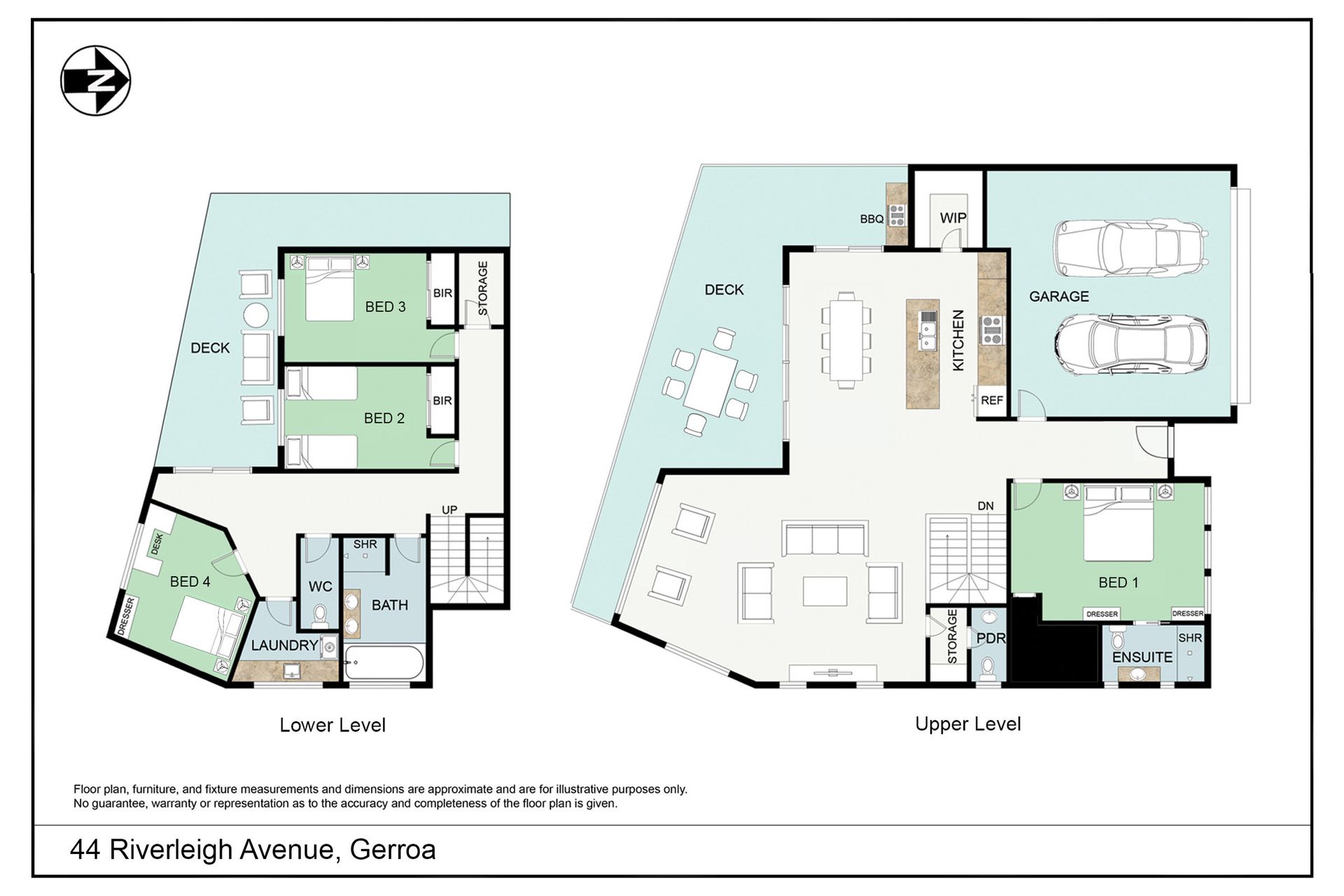 Riverleigh is a two level home with lovely views from the upper level of Seven Mile Beach and the Crooked River estuary. Set on a sloping block, you enter into the top level which features the master bedroom with ensuite, open plan kitchen, dining and living area, and the spacious deck. The gas BBQ is located on the upstairs deck. Downstairs you will find the other 3 bedrooms, bathroom with bathtub and the laundry. The queen bedroom downstairs also has a full sized desk. There is also a second deck area downstairs that leads onto the lawn.