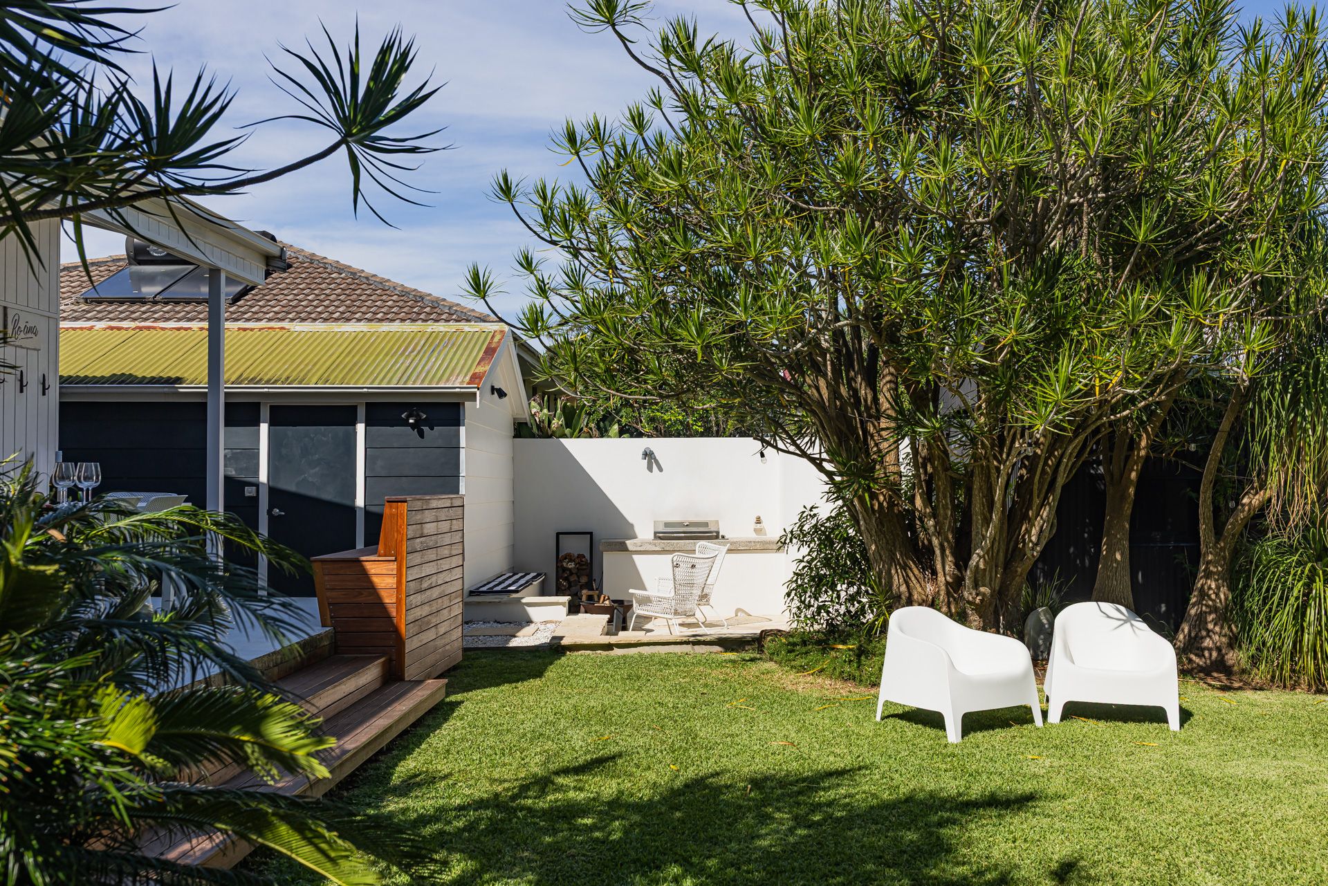In the house, Ro-ana has two queen bedrooms and a third sleep out area with a queen bed that is open to the living area and overlooks the deck. The fully equipped kitchen has an oven, cooktop, microwave and coffee machine that is compatible with Nespresso pods. The large dining table can comfortably seat 8. The living area, with its beautiful fireplace, has sliding doors that open onto the backyard. There are two bathrooms, one that is next to the sleep out area with a shower and toilet, and the main bathroom with bath, shower and toilet. The Studio is a self contained dwelling with north facing windows that includes a full kitchen, dining table, bed and lounge, and bathroom. The washing machine and dryer can be found in the garage, along with a table tennis table!