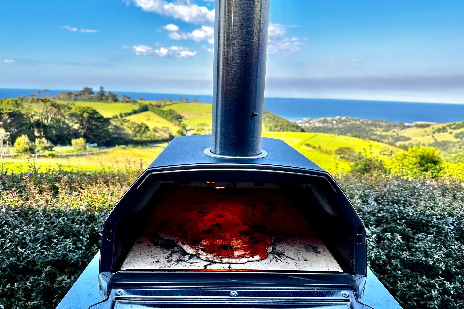 The covered front verandah has spectacular 180 degree farm to coast views with a dining table and a pizza oven so you can cook up a storm. There is also a gas BBQ (stored in the garage).