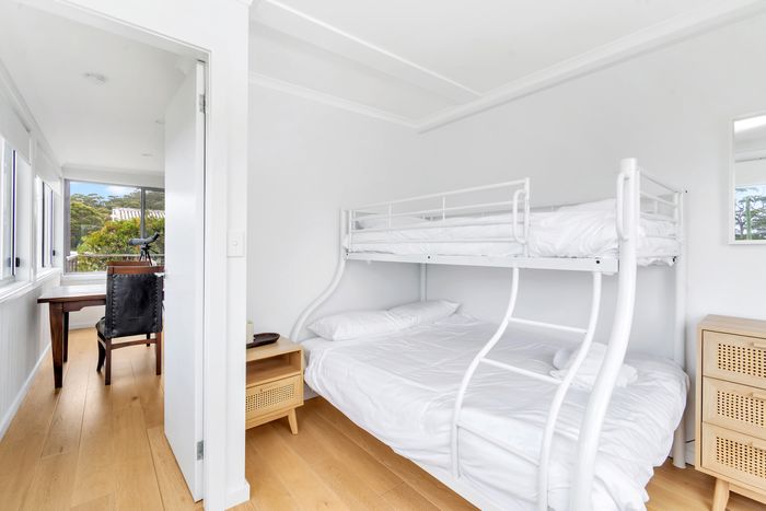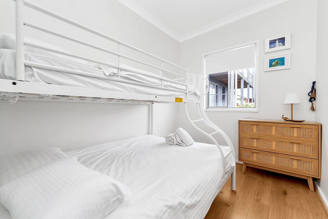 Sailor's Cottage has open plan living and kitchen with direct access to the outdoor deck with seating. The kitchen is fully equiped with oven, stovetop, fridge, microwave and coffee pod machine. There are three bedrooms: one Queen, and two with tri-bunks, sleeping a total of 8 guests. The shared bathroom has a shower and toilet, with an additional toilet in the laundry. There is space for parking three cars in the driveway.