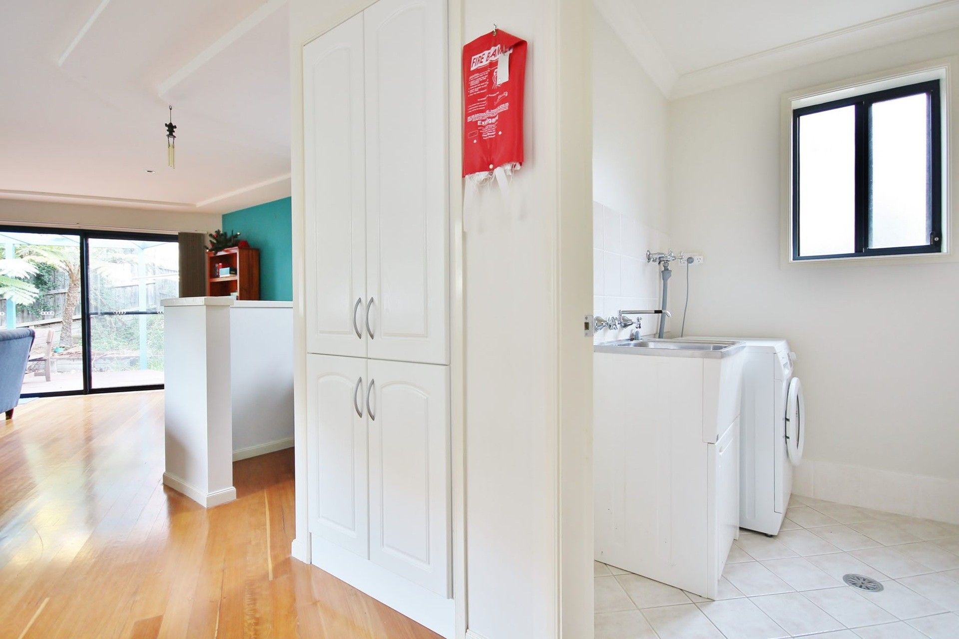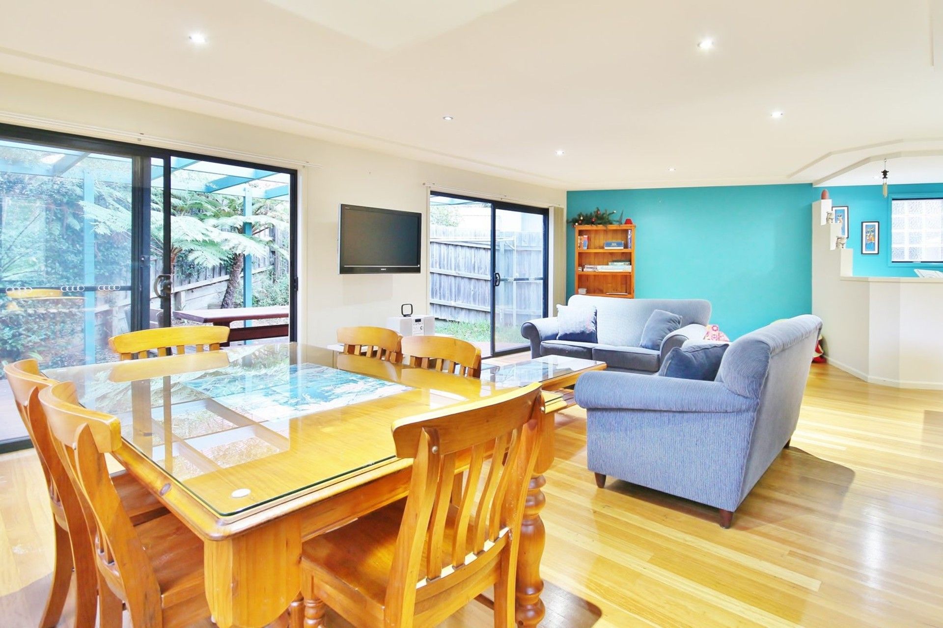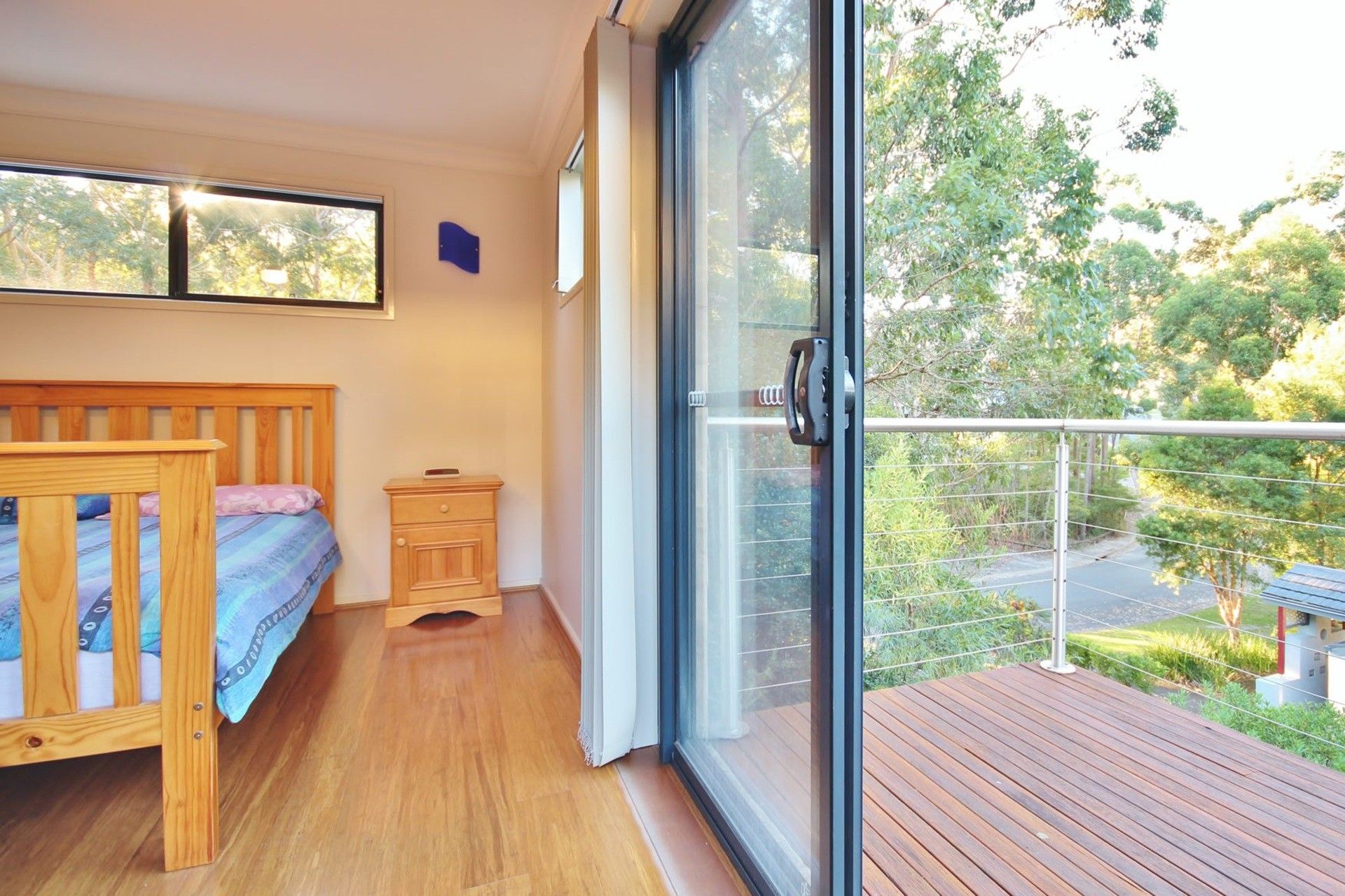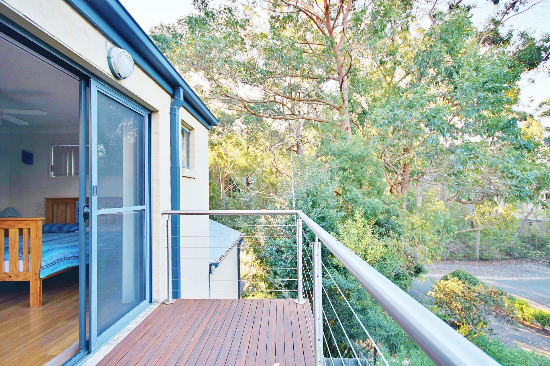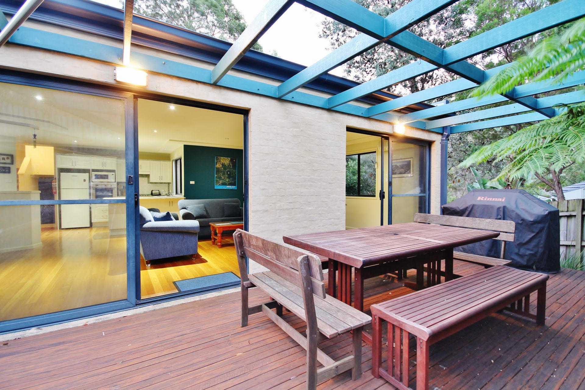 The deck spans the length of the living area and the house can be opened up to allow an indoor/outdoor living experience. There is an outdoor setting and BBQ for alfresco dining.
