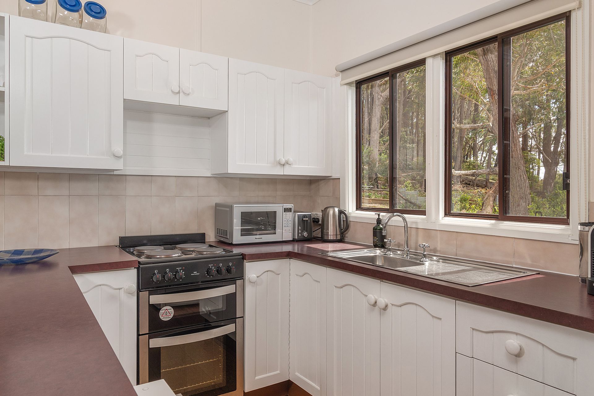 There are three bedrooms, a queen with TV, a double and a bunk room, all with built ins. The bathroom and toilet have been renovated with a separate additional toilet. The lounge and kitchen are open plan and lead onto the back deck which overlooks the good sized backyard and the bush beyond. The laundry is off the deck and has a washing machine and dryer.