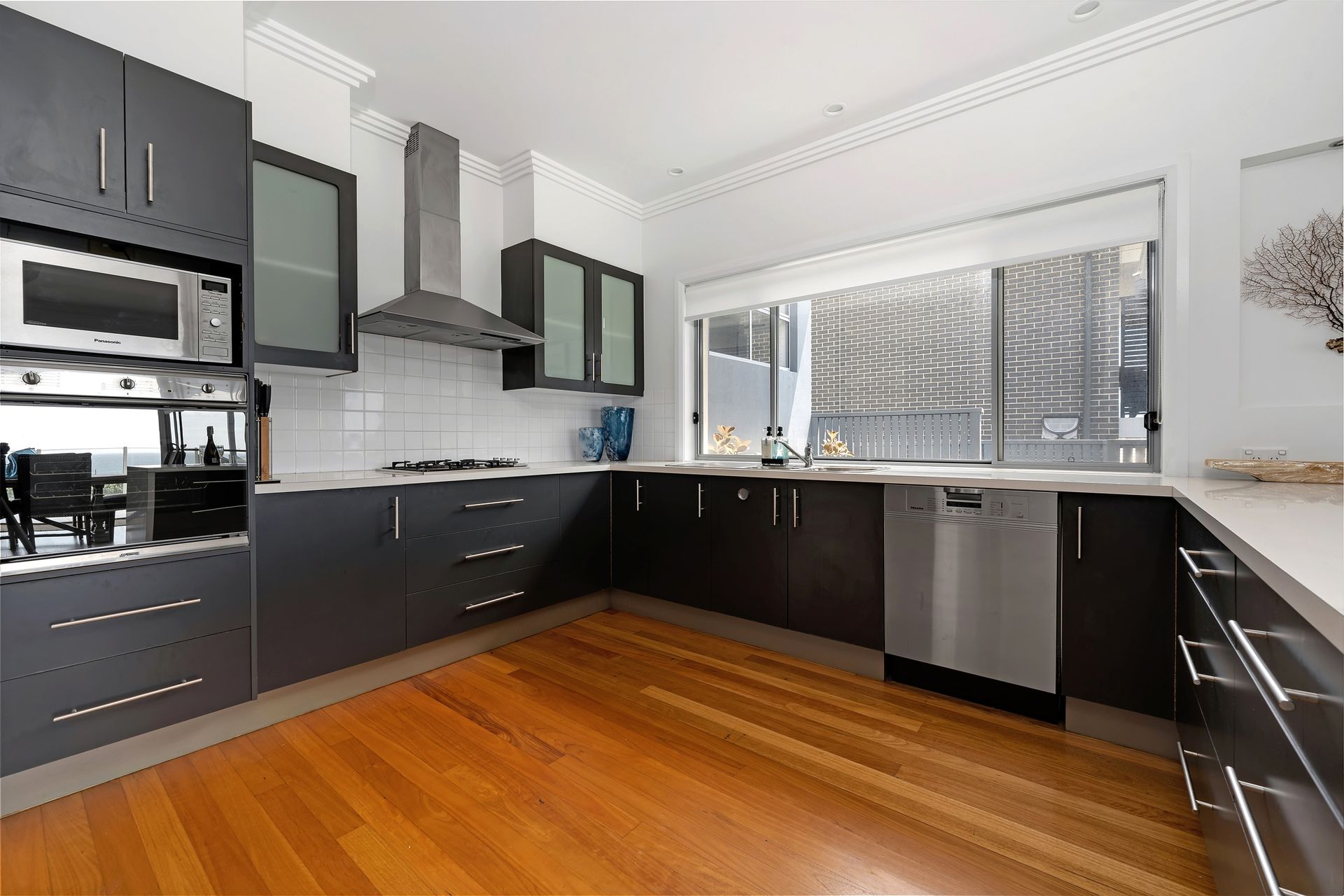 The second level is a few stairs lower than the entry level. On this level is an open plan living/dining/entertaining area. The lounge room has a gas fireplace, and the gourmet kitchen is fully equipped with a five burner gas hob, electric wall oven, microwave and dishwasher. The generous outdoor entertainment area has an outdoor dining table and BBQ. The pool is accessed by via this area. The master bedroom with ocean view is on this level, and features an ensuite bathroom, separate toilet and walk in wardrobe. ocean views and built in wardrobe. The laundry with washing machine and dryer is also on this level.
