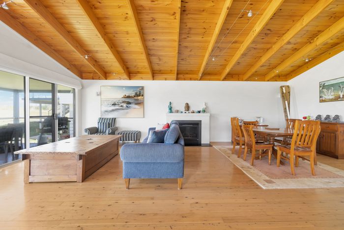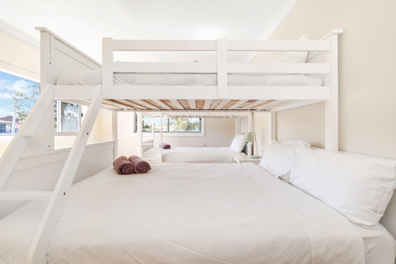Upstairs is the main living area, kitchen, dining area, and all bedrooms. The main bedroom with queen bed has a walk in wardrobe and ensuite (shower and toilet). There are two more queen bedrooms on this level, both with built in robes. The fourth bedroom sleeps 5 guests in a triple bunk and double bunk. The shared bathroom has a shower and bath, and there is a separate toilet. The open plan lounge room is generously sized with two lounge areas. The lounge room leads directly onto the covered verandah with an outdoor table and gas BBQ, where guests can enjoy the sea breeze! The modern kitchen is well equipped with coffee machine, dishwasher, oven and gas cooktop.