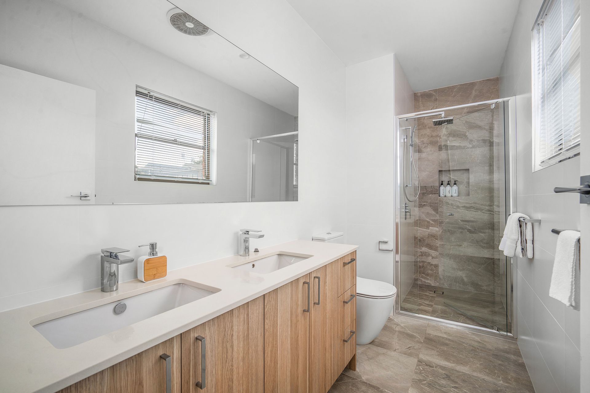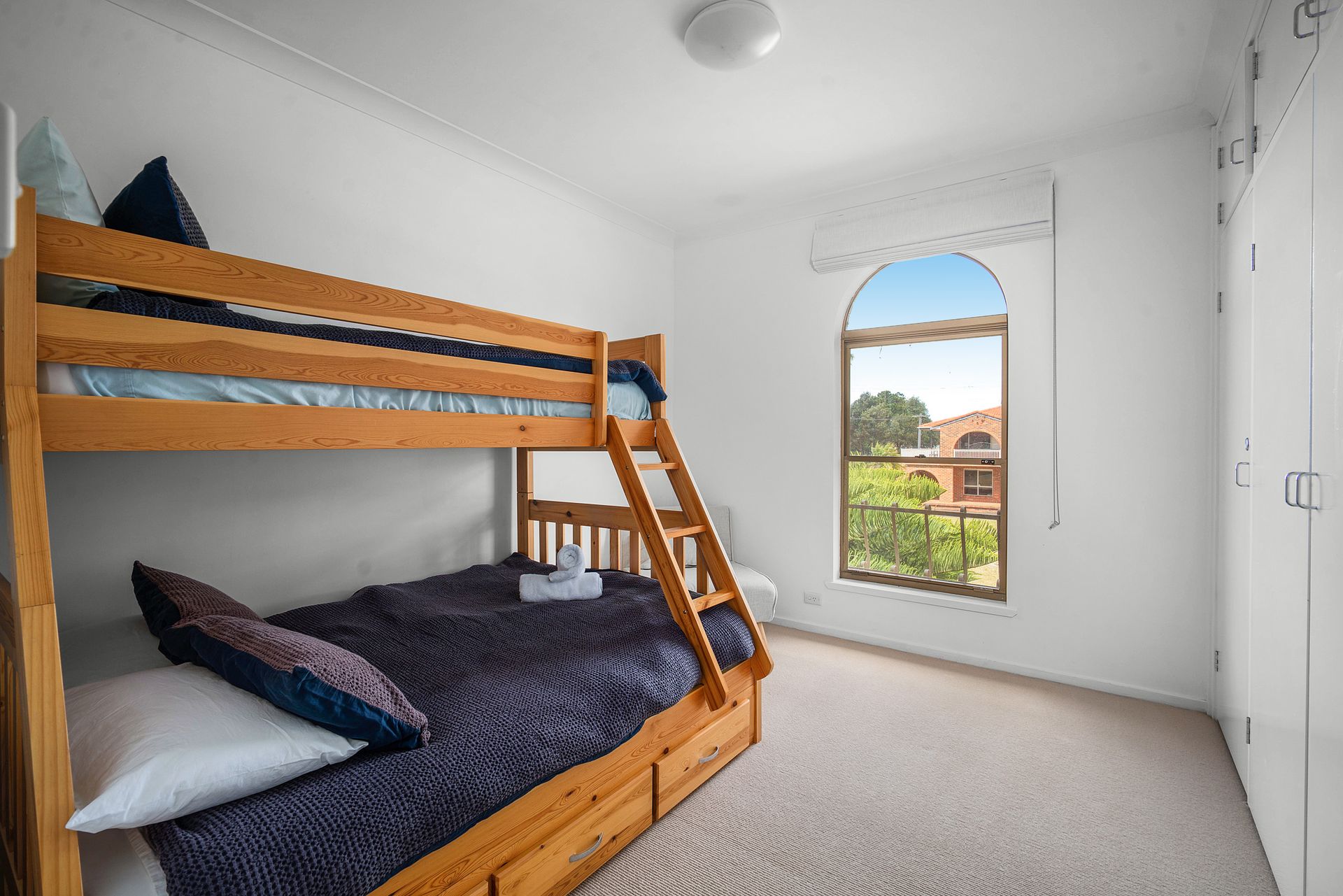 Sea Level at Vincentia is a large, two storey house. The ground level includes a generous living area with views to Jervis Bay through a picture window, a gas fireplace and TV - a great place to relax together after a day exploring Jervis Bay! There is a separate fully equipped kitchen with large central island bench and seating, and a separate dining room where you can access the outdoor terrace area with bar table and BBQ. The laundry is located on this level and has a shower and toilet. An additional office room is a great break away space for kids, and the garage can also be accessed from this level. The bedrooms and additional bathrooms are all located upstairs. The master bedroom has a beautiful view to Jervis Bay, and an ensuite with shower and toilet. The three remaining bedrooms, one with views of the bay, have 2 queens and one tri-bunk bed. There is a shared bathroom with shower and bath, and a separate toilet.