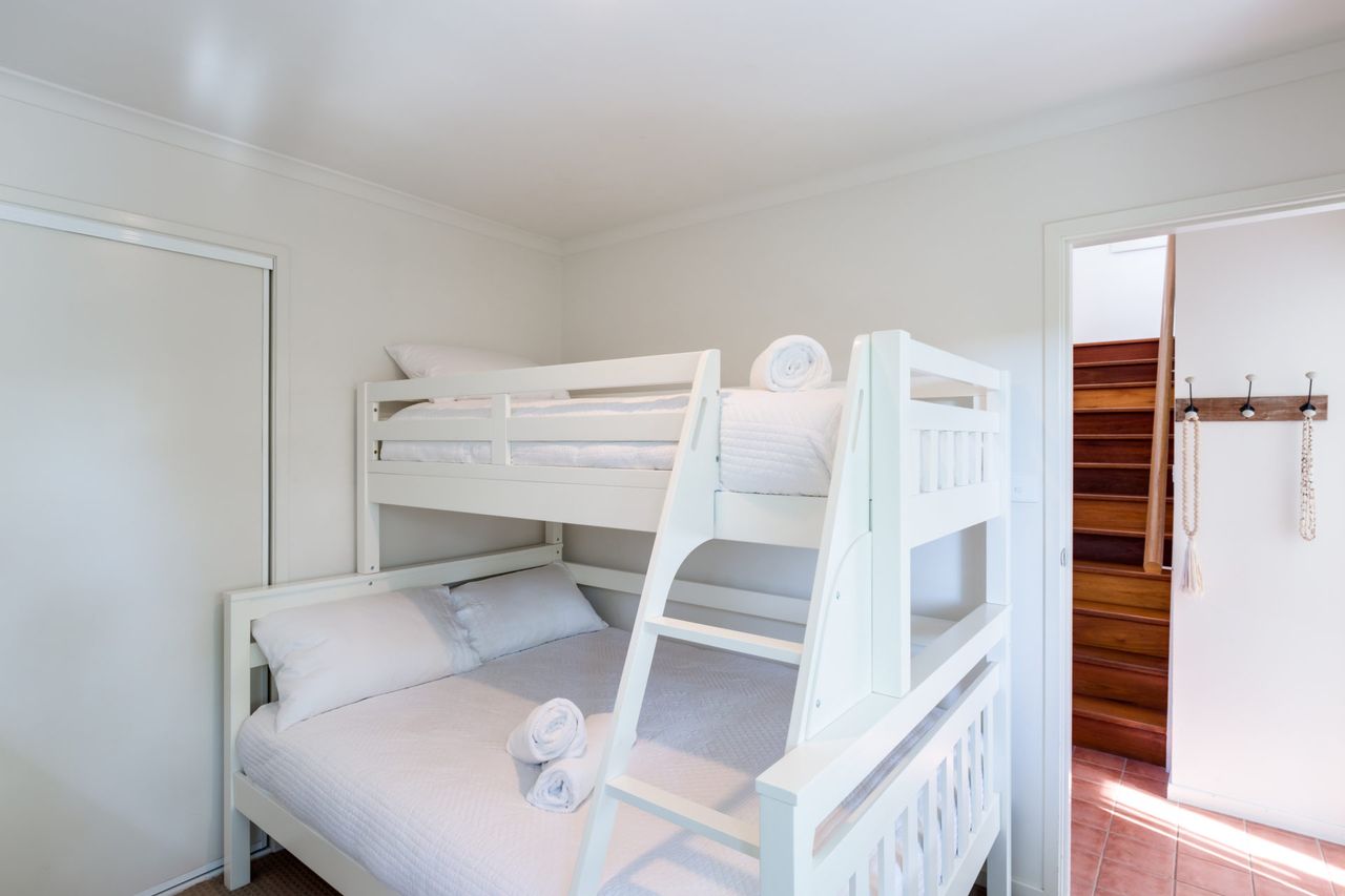 On the ground floor there are two beautifully decorated bedrooms overlooking the leafy courtyard garden. The main queen bedroom has a small private deck accessed via sliding doors, and a TV for those quiet times. The second bedroom has a tri bunk furnished with luxury linen. Also on this level is a bathroom with a roomy shower plus separate basin and toilet. The European style laundry is right next to the bathroom complete with a dryer.